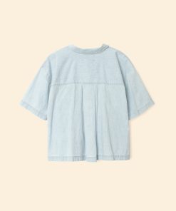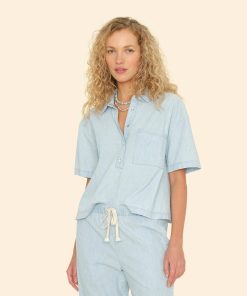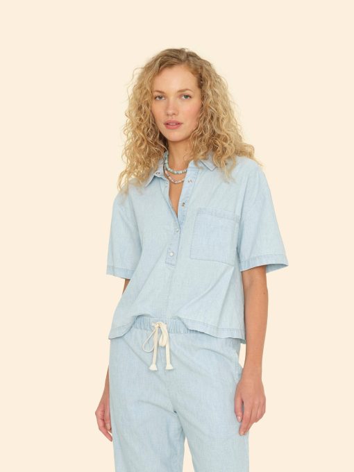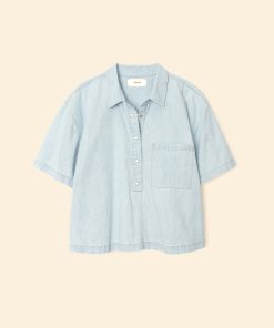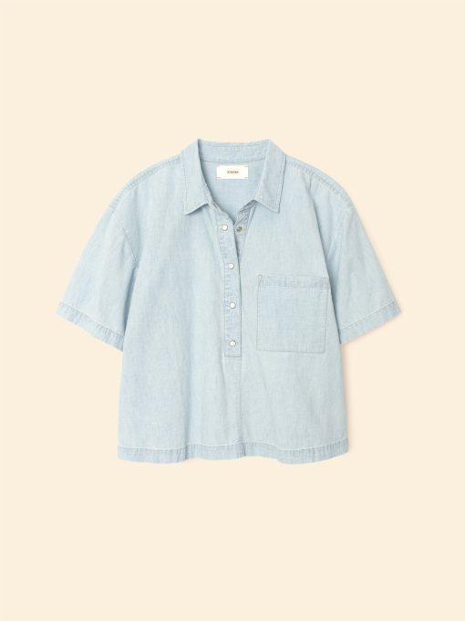Be Cool. Adler is new this season in our lightweight, soft-woven cotton chambray in a classic light blue wash. This boxy shirt features a partial button-front with pearlized snap buttons, point collar, left chest pocket, elbow sleeves, and a box-pleated back yoke.