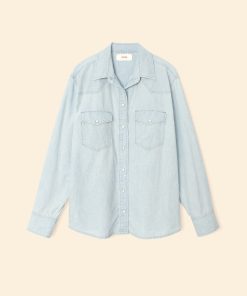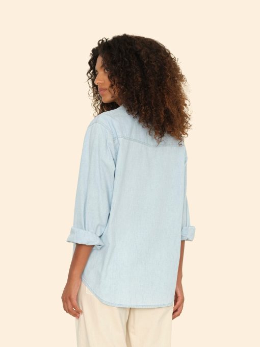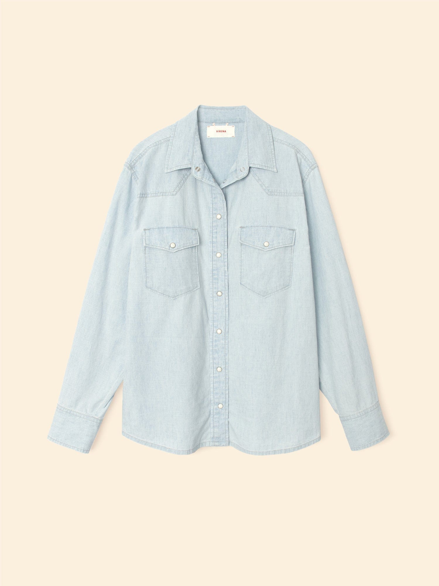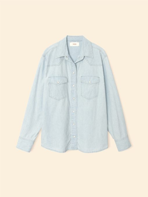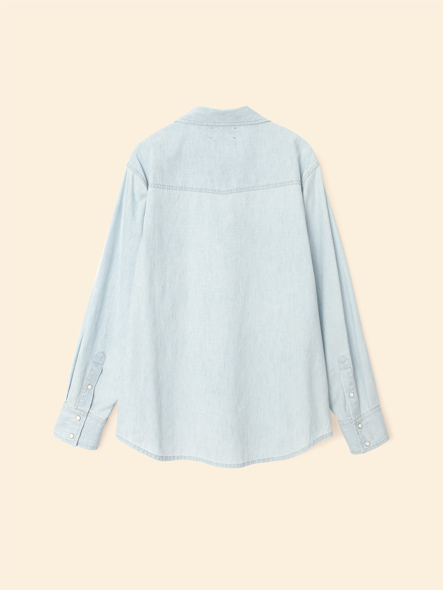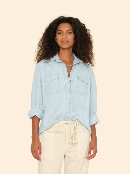 Be Cool. Griffen is updated this season in our lightweight, soft-woven cotton chambray in a classic light blue wash. Griffen is a button-front shirt with a Western-inspired yoke, pearlized snap buttons, and two front chest pockets with a snap button closure.