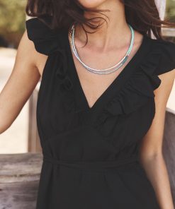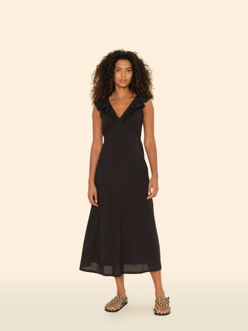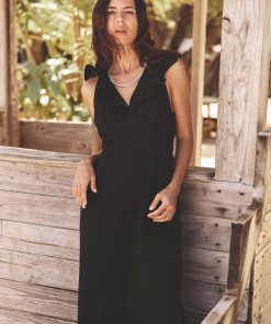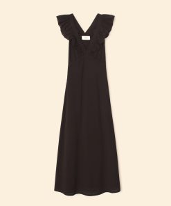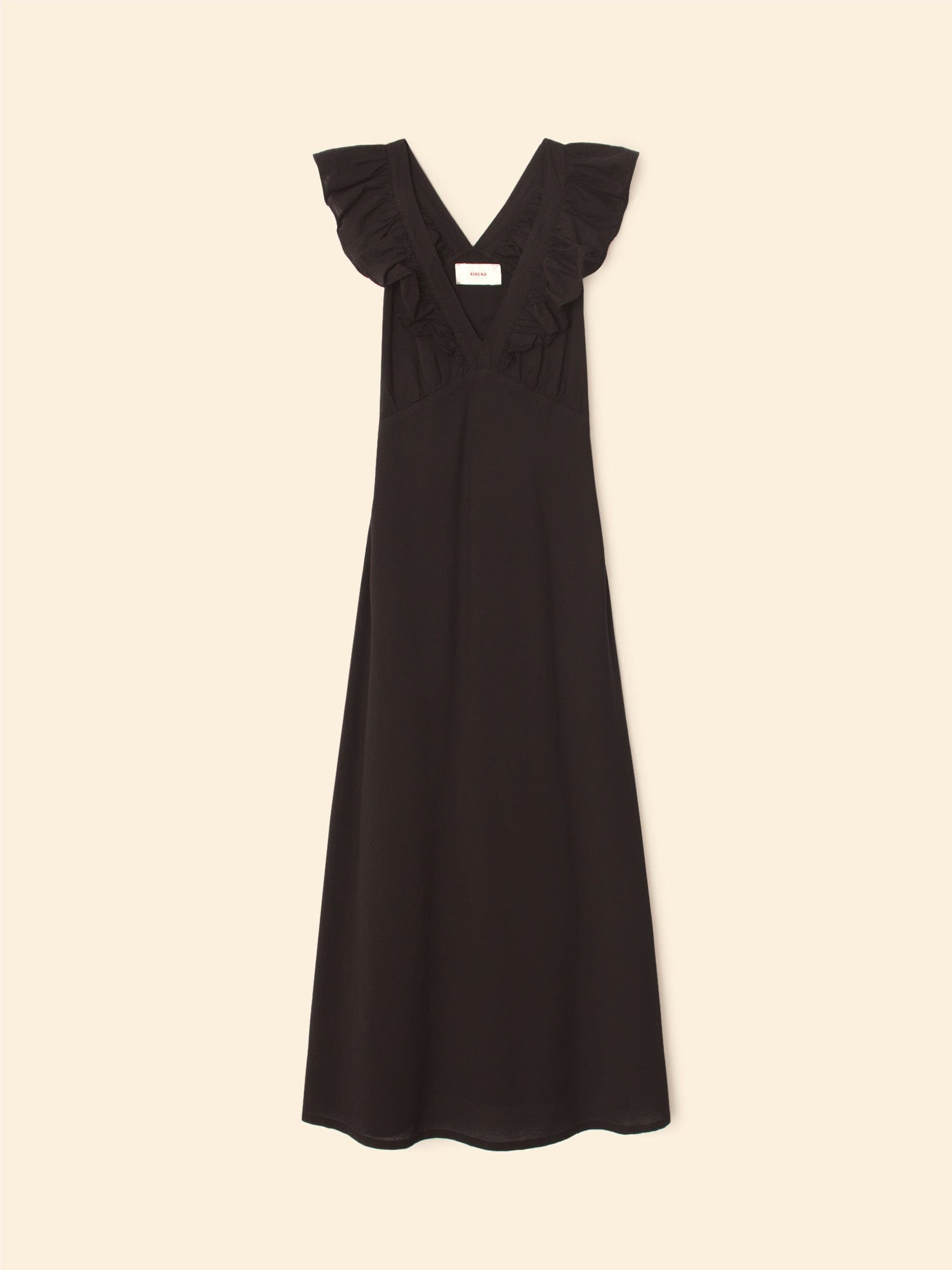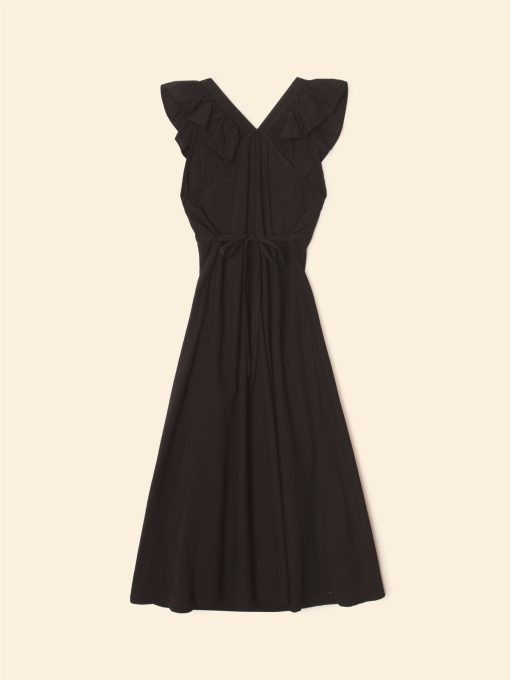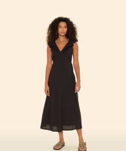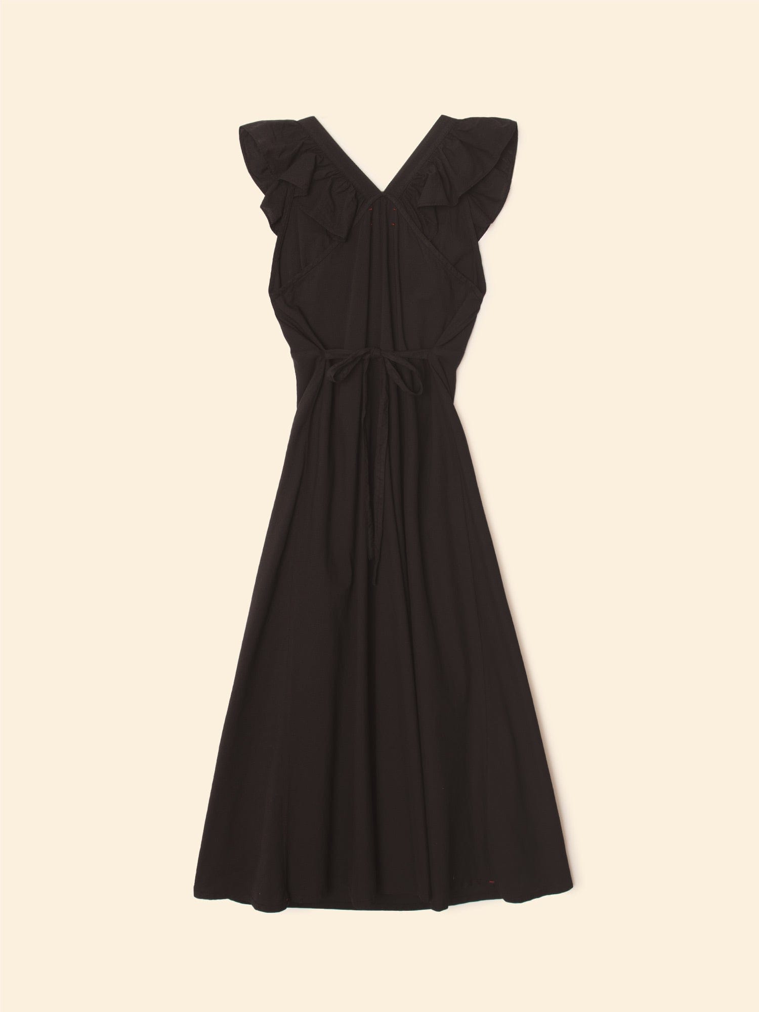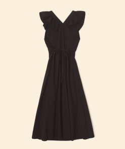 Ruffle Up. Candace is new this season in our classic lightweight woven cotton poplin for a lived-in look and feel. Candace is a fully lined midi dress with a V-neck, ruffle trim, empire waist, and tie-back.