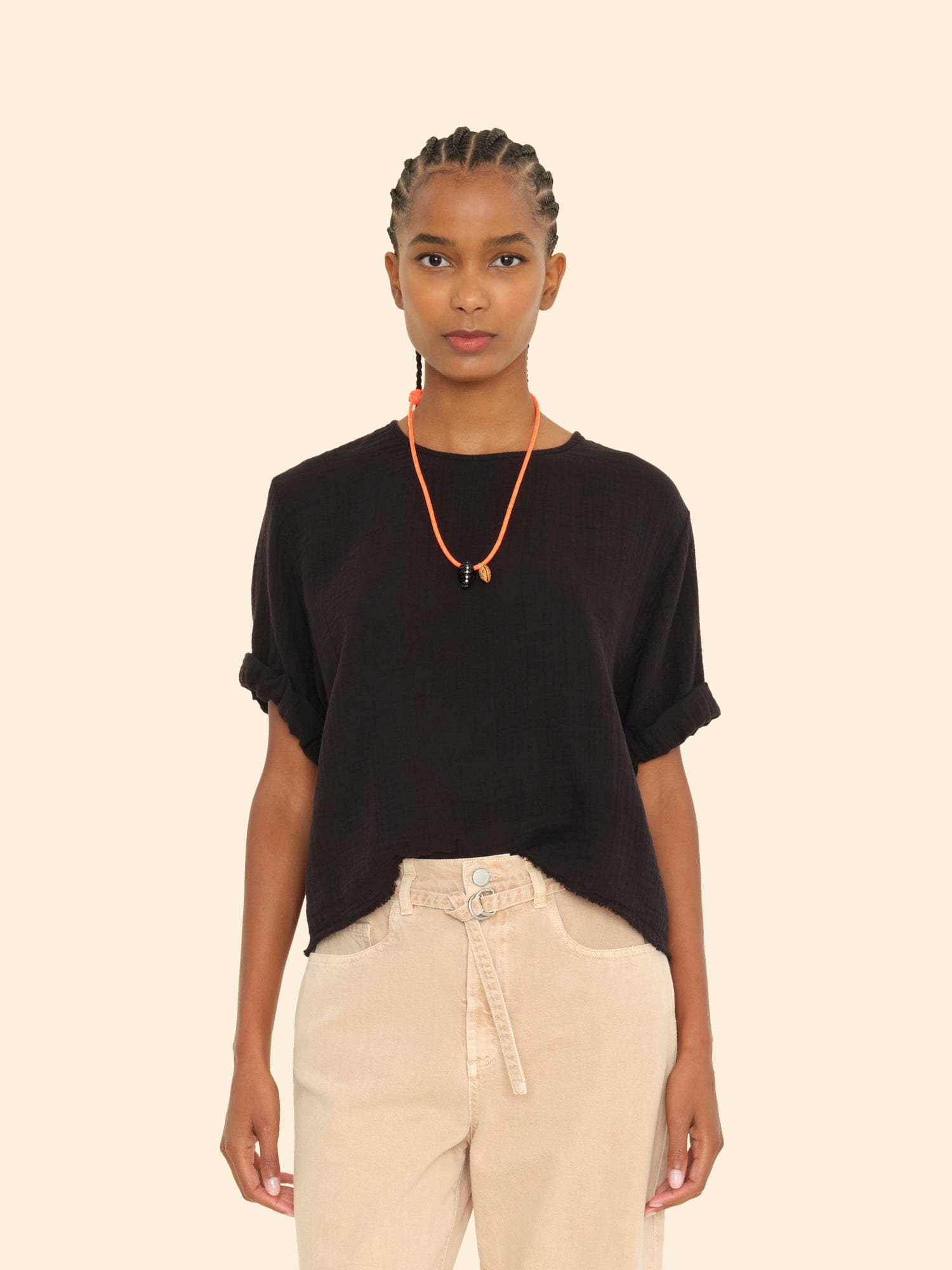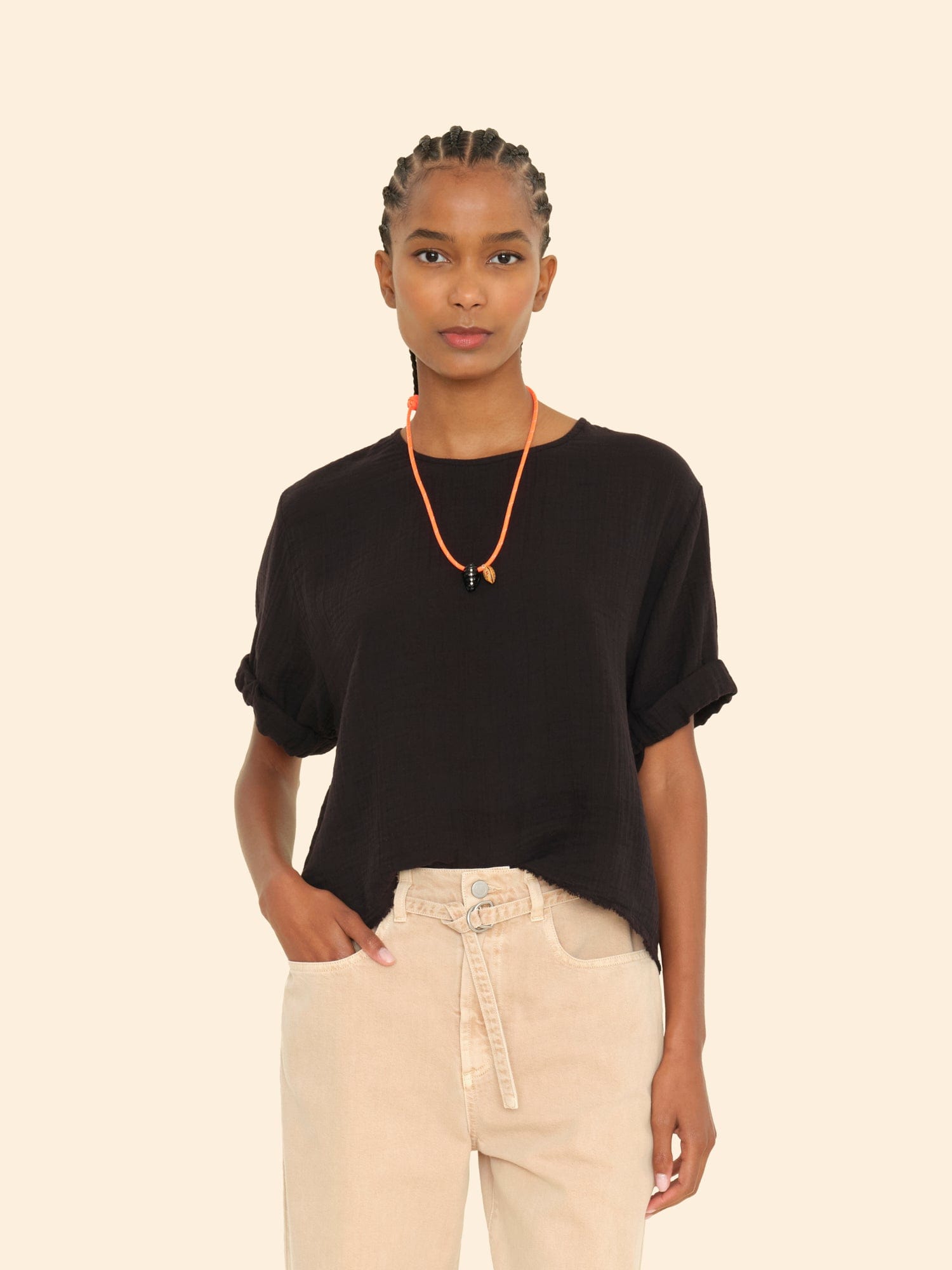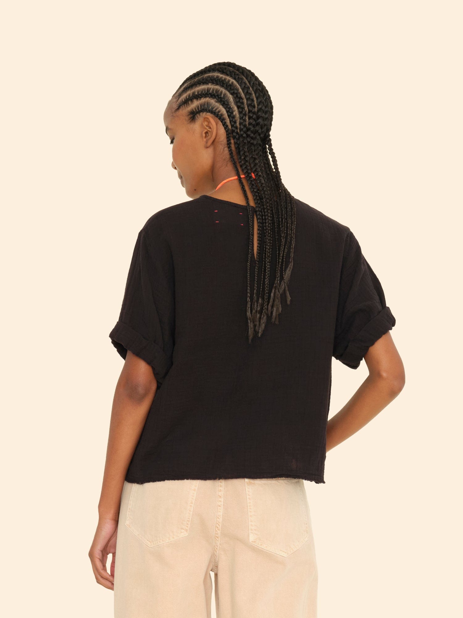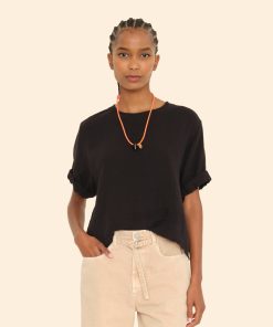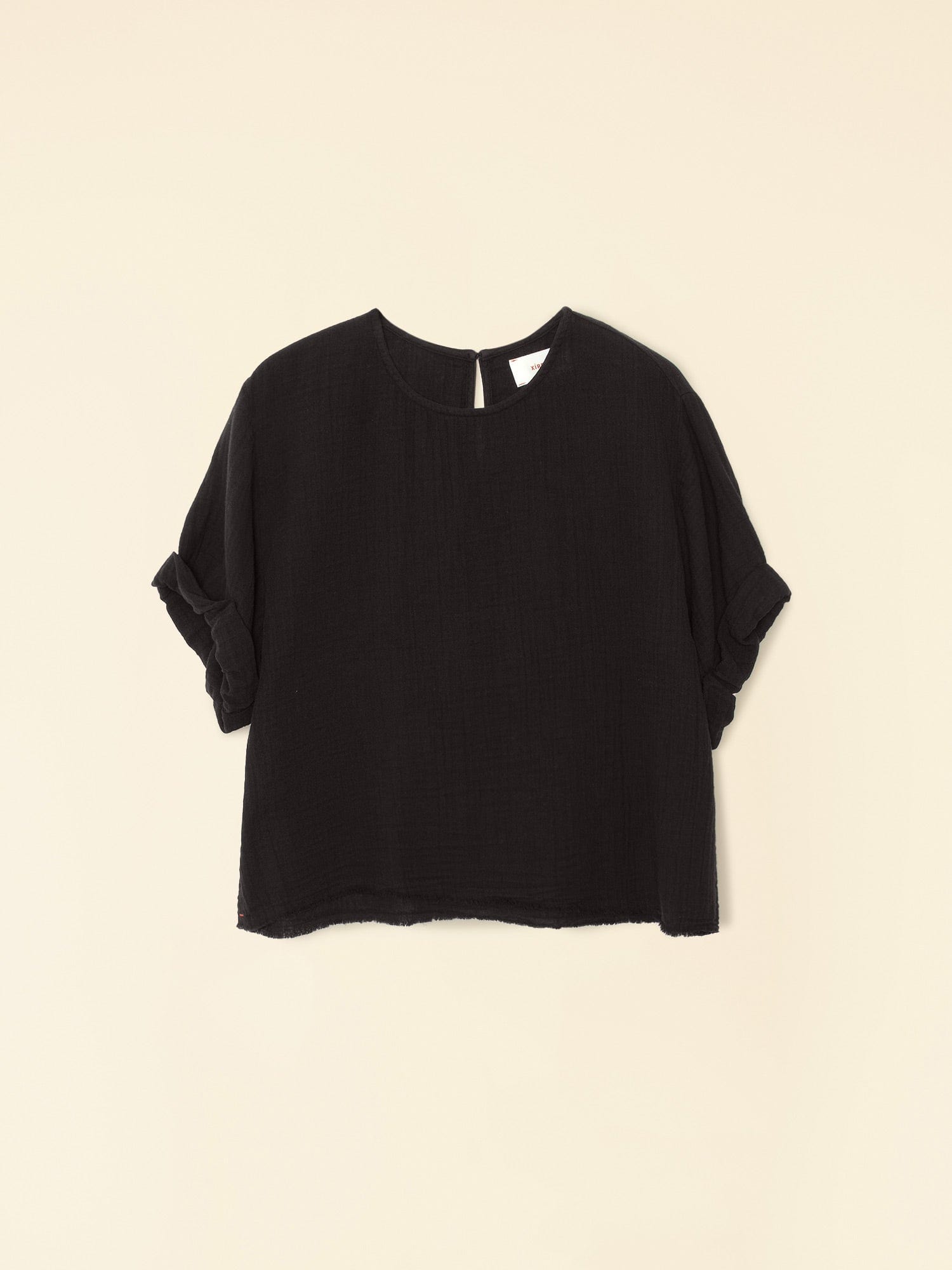 Bare Necessities. Carson is made in our washed double faced cotton gauze for a soft, gently crinkled feel. This popover top features a scoop neck, stitched rolled sleeves, and keyhole button-back.