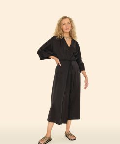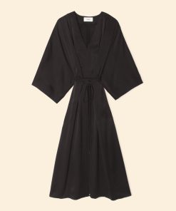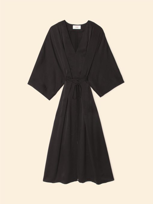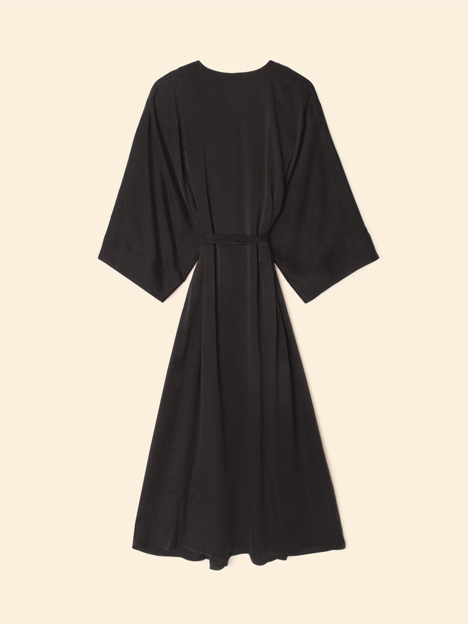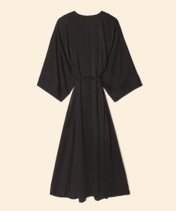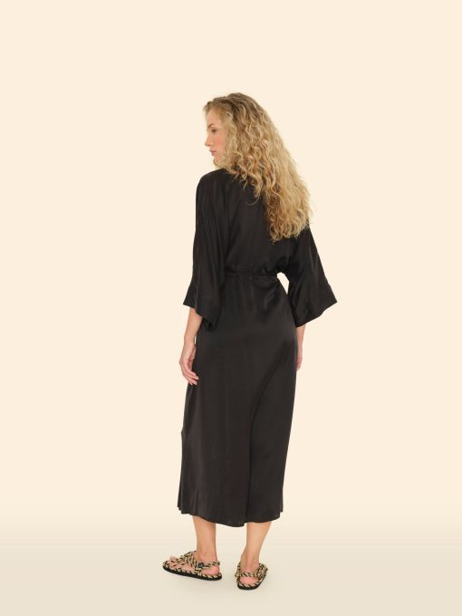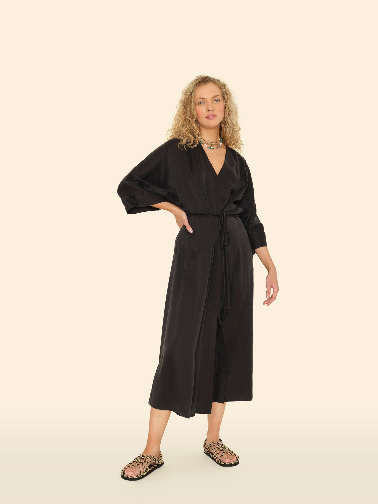 Hidden Gems. Juliet is new this season in our luxe sandwashed silk charmeuse. This elegant kimono style midi dress features a deep V-neck, self-tie waist, and a center-front slit.