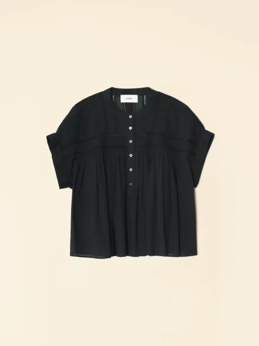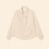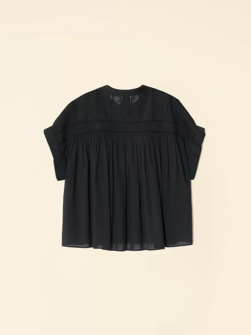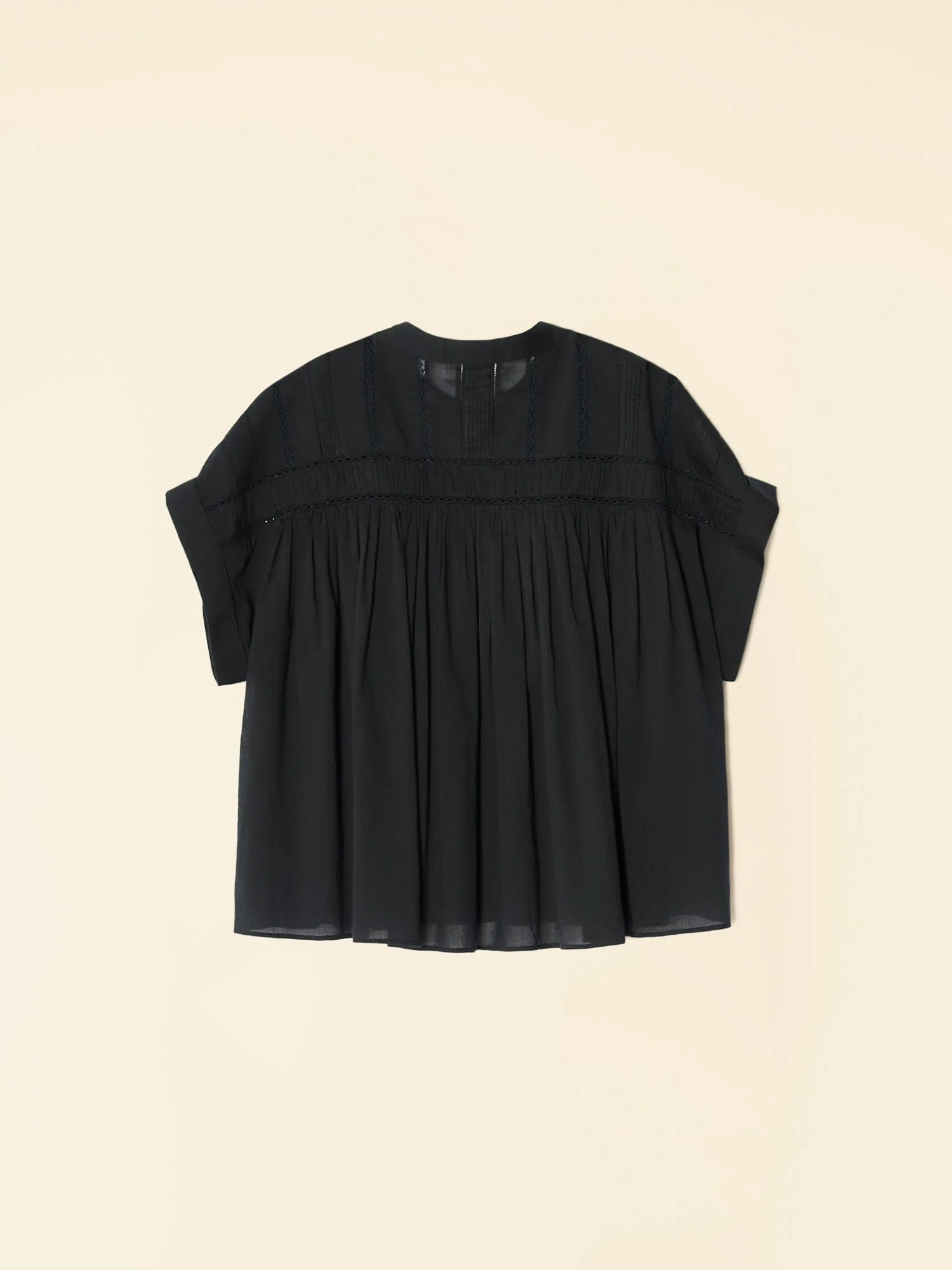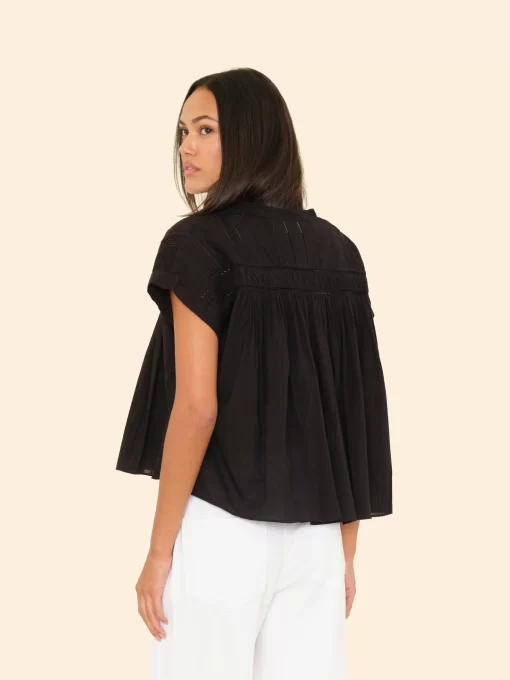Picture Perfect. Louelle is new this season in our superfine cotton voile with a soft hand. Louelle is a relaxed ultra-femme top with a partial button-front, band collar, pintucks, lace trim, and shirred front and back yokes.