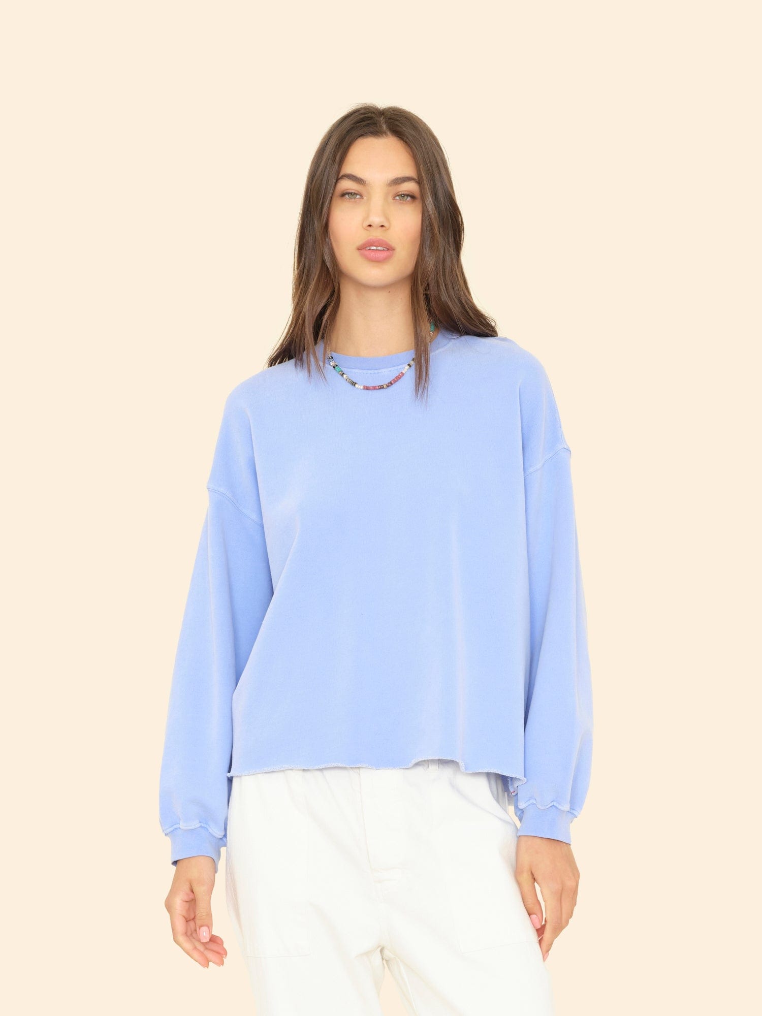 Make a (Cozy) Statement. Honor is updated this season in our organic mineral wash terry utilizing an eco-friendly dyeing process with natural dyes. This timeless sweatshirt has full length sleeves and a slightly cropped raw edge hem.