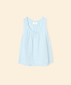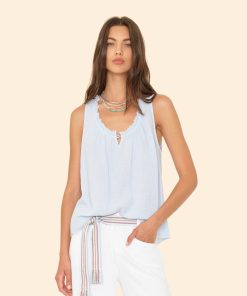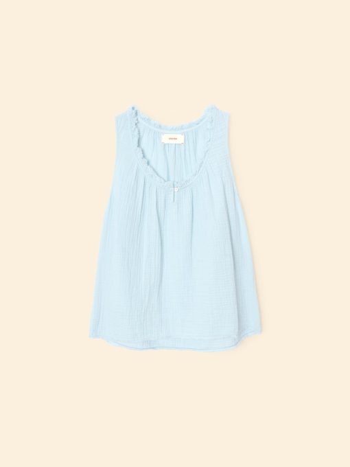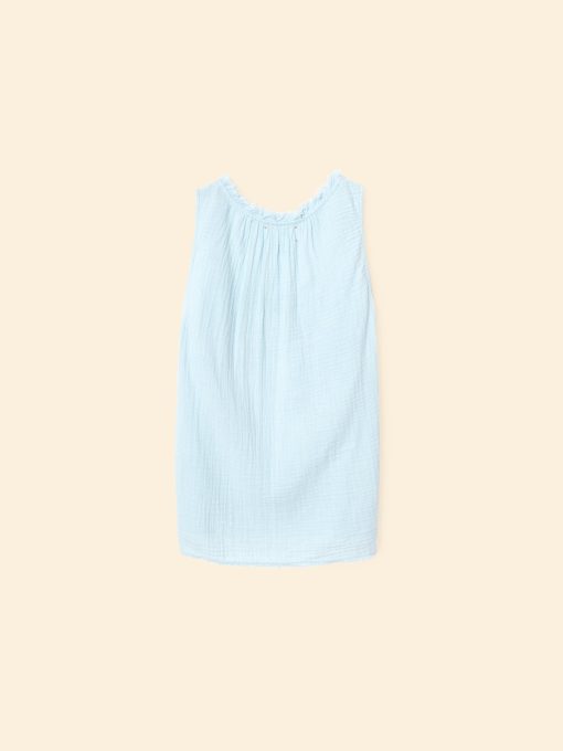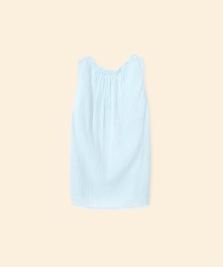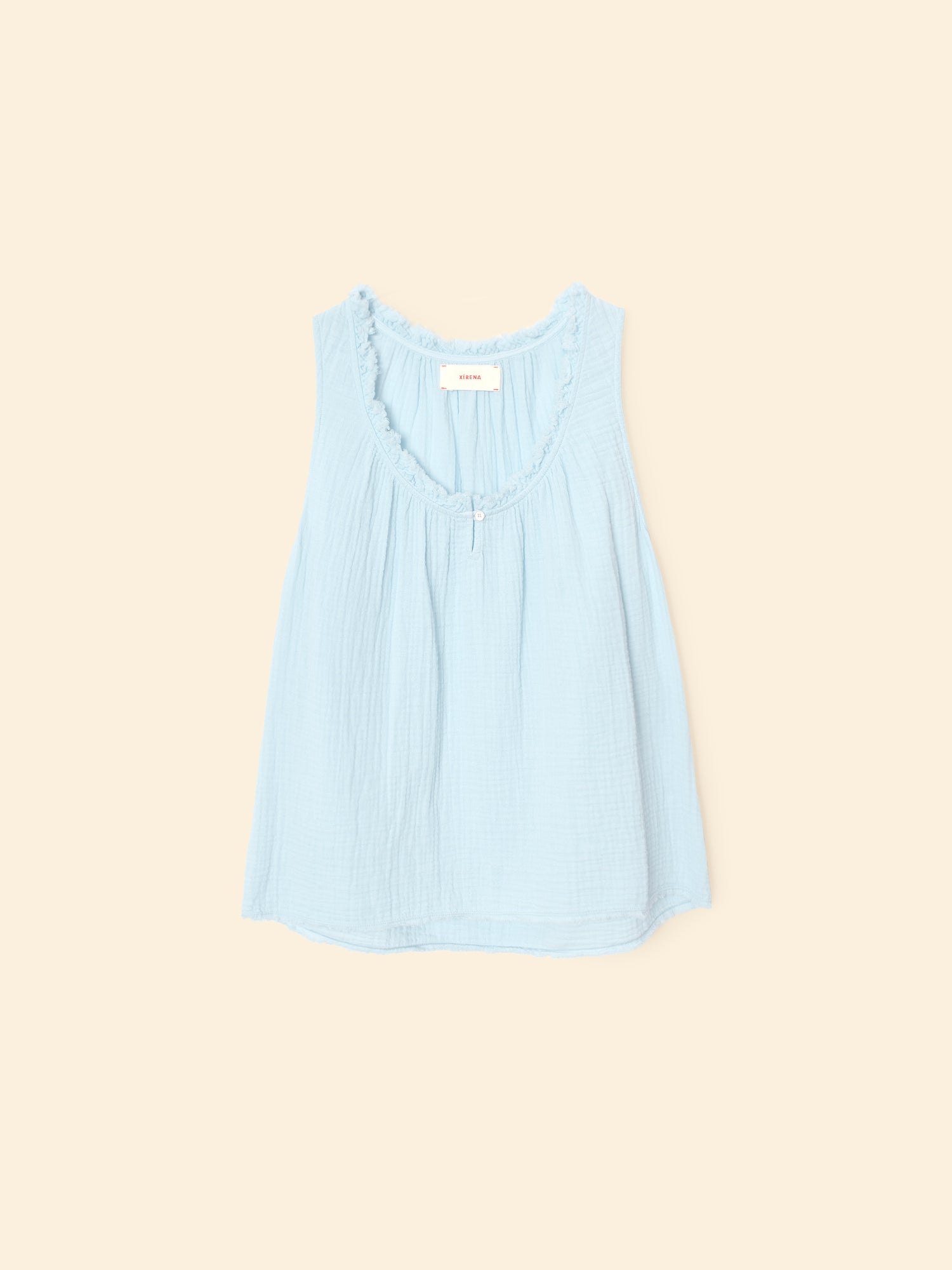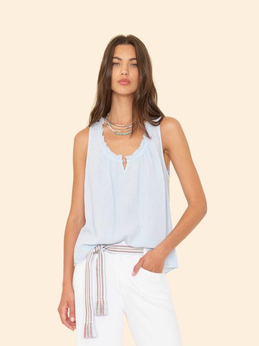 Easy Breezy. Rosie is new this season in our washed double faced cotton gauze for a soft, gently crinkled feel. This sleeveless top features a raw edge scoop neck, keyhole button-front, and shirring throughout.
