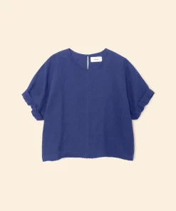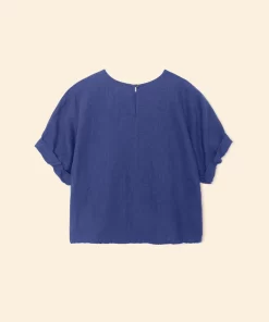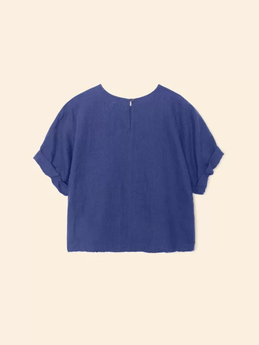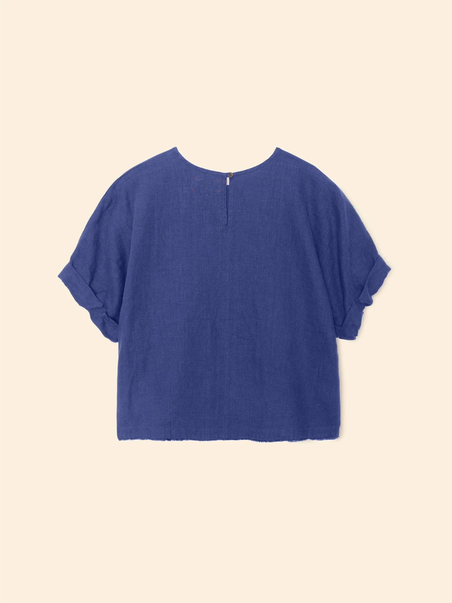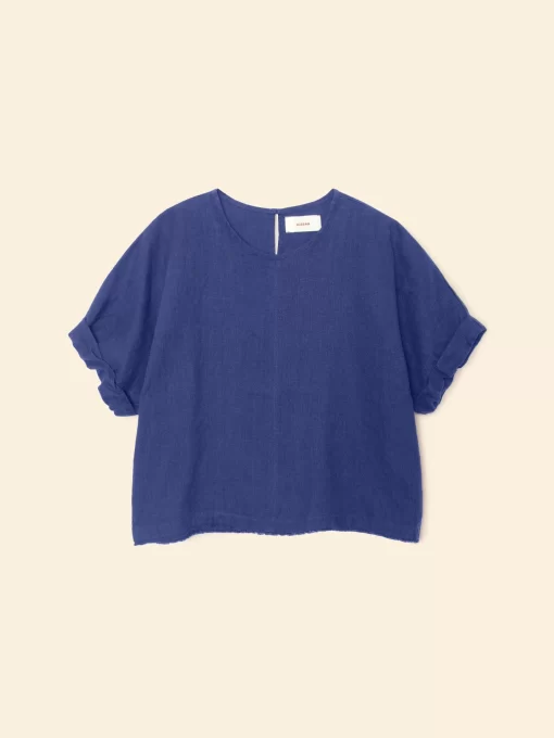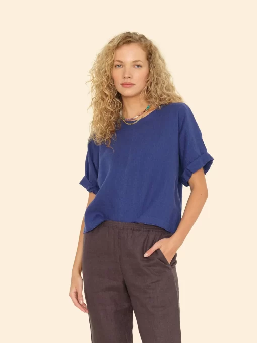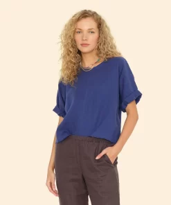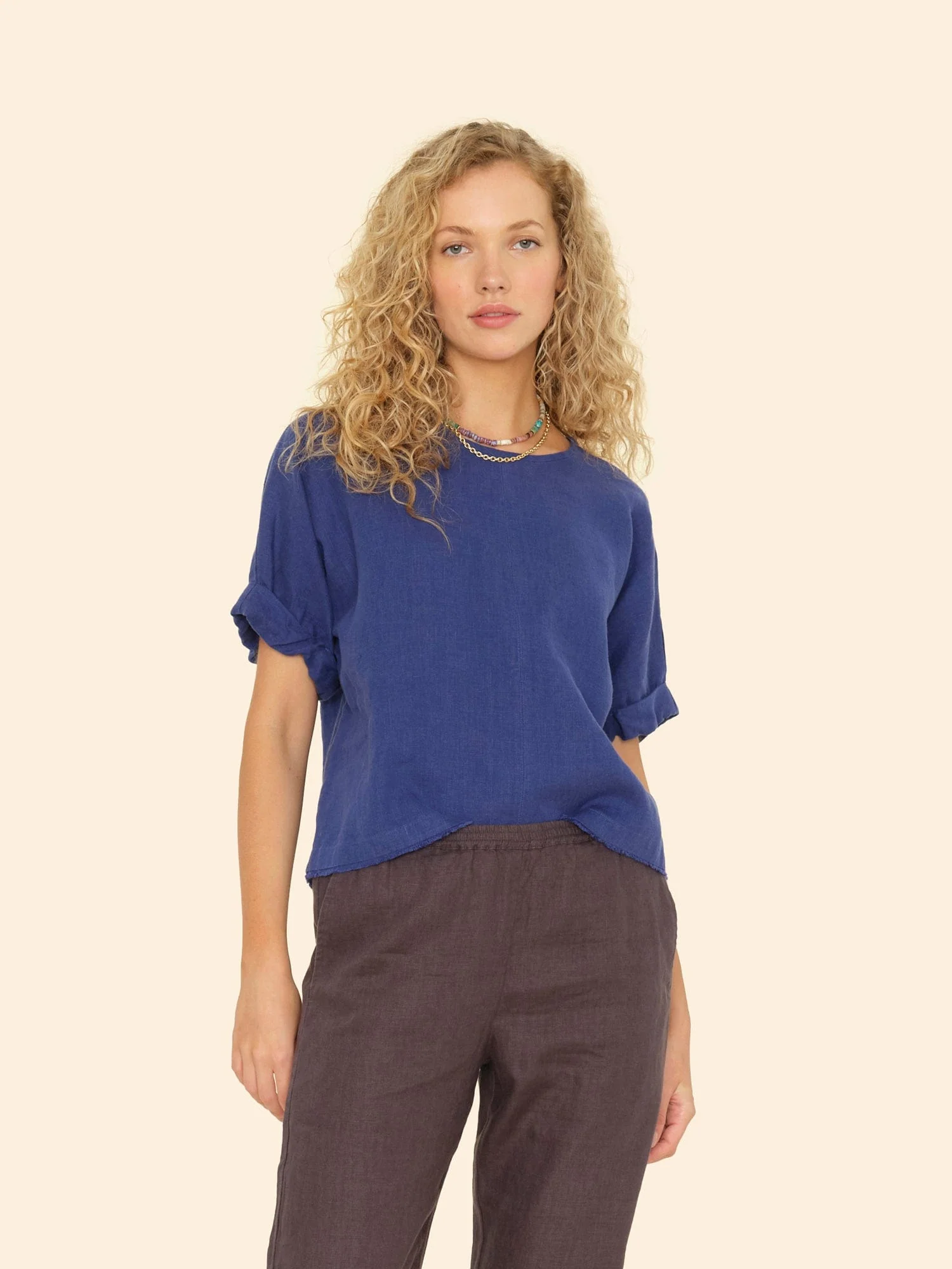 Vacation Mode. Savoye is new this season in our lightweight linen. This easy pullover top features stitched rolled sleeves, raw edge hem, and a keyhole button-back.
