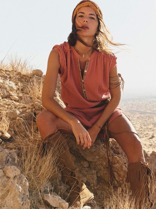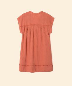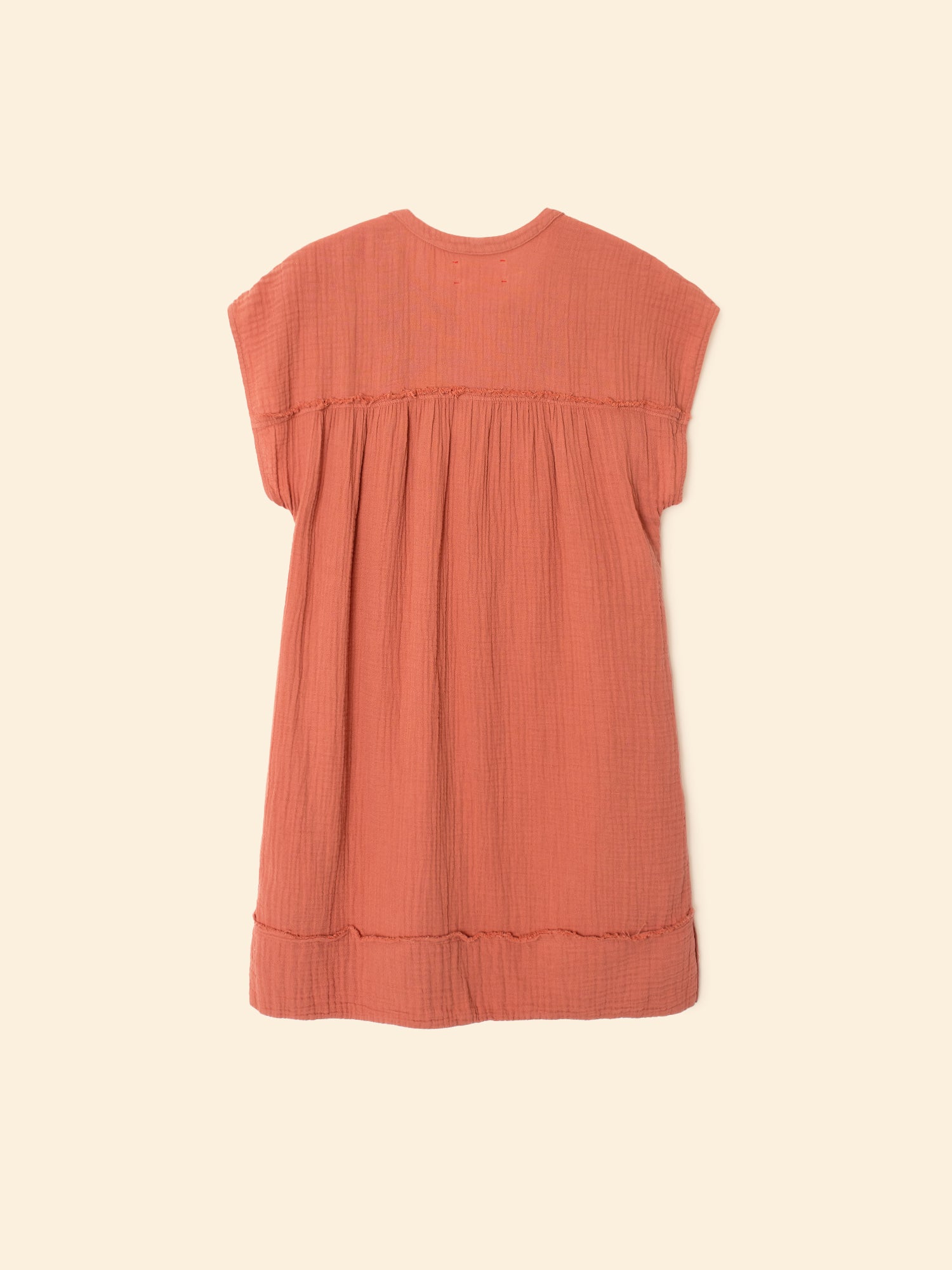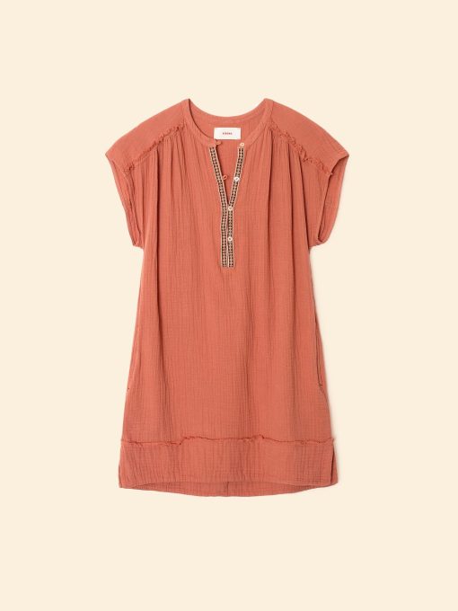 French allure meets California ease. Talula is made in our washed double faced cotton gauze for a soft, gently crinkled feel. This mini shift dress features an extended shoulder, multi-colored embroidery trim at the neck with a rouleau button-front, side seam pockets, and raw edge details.