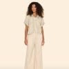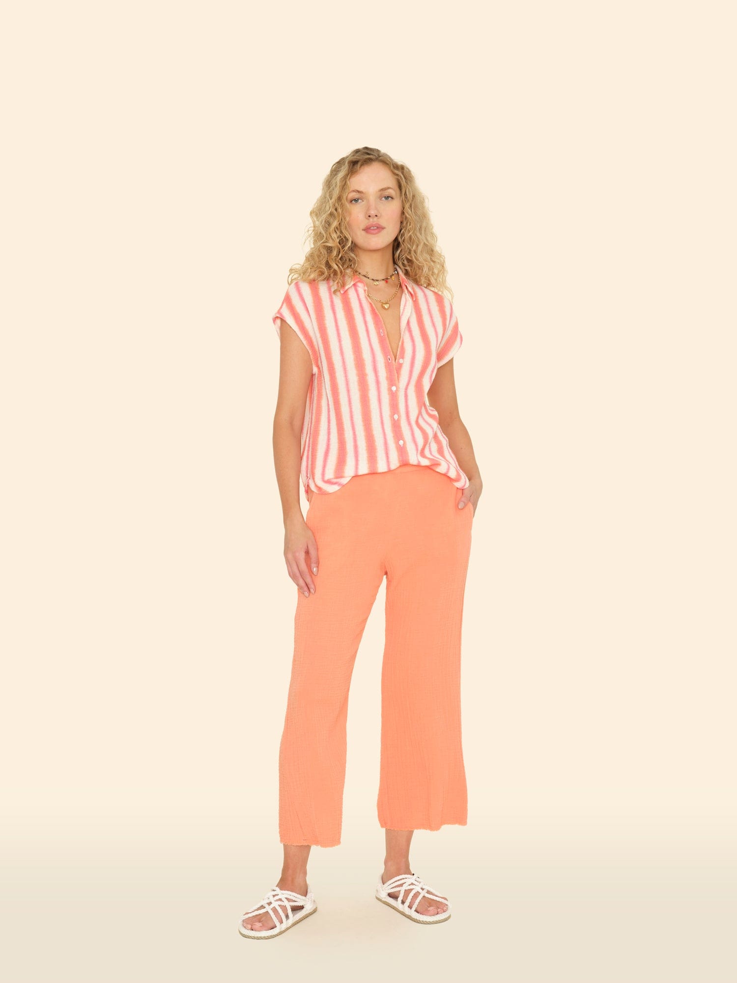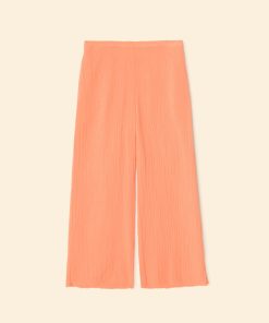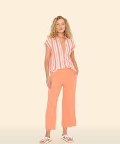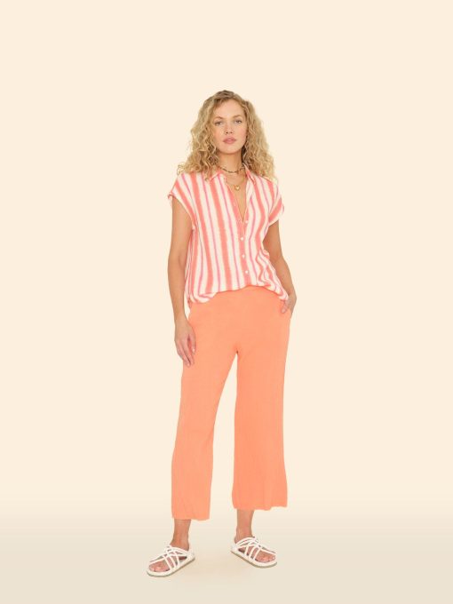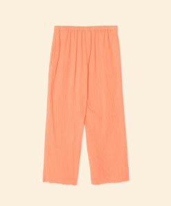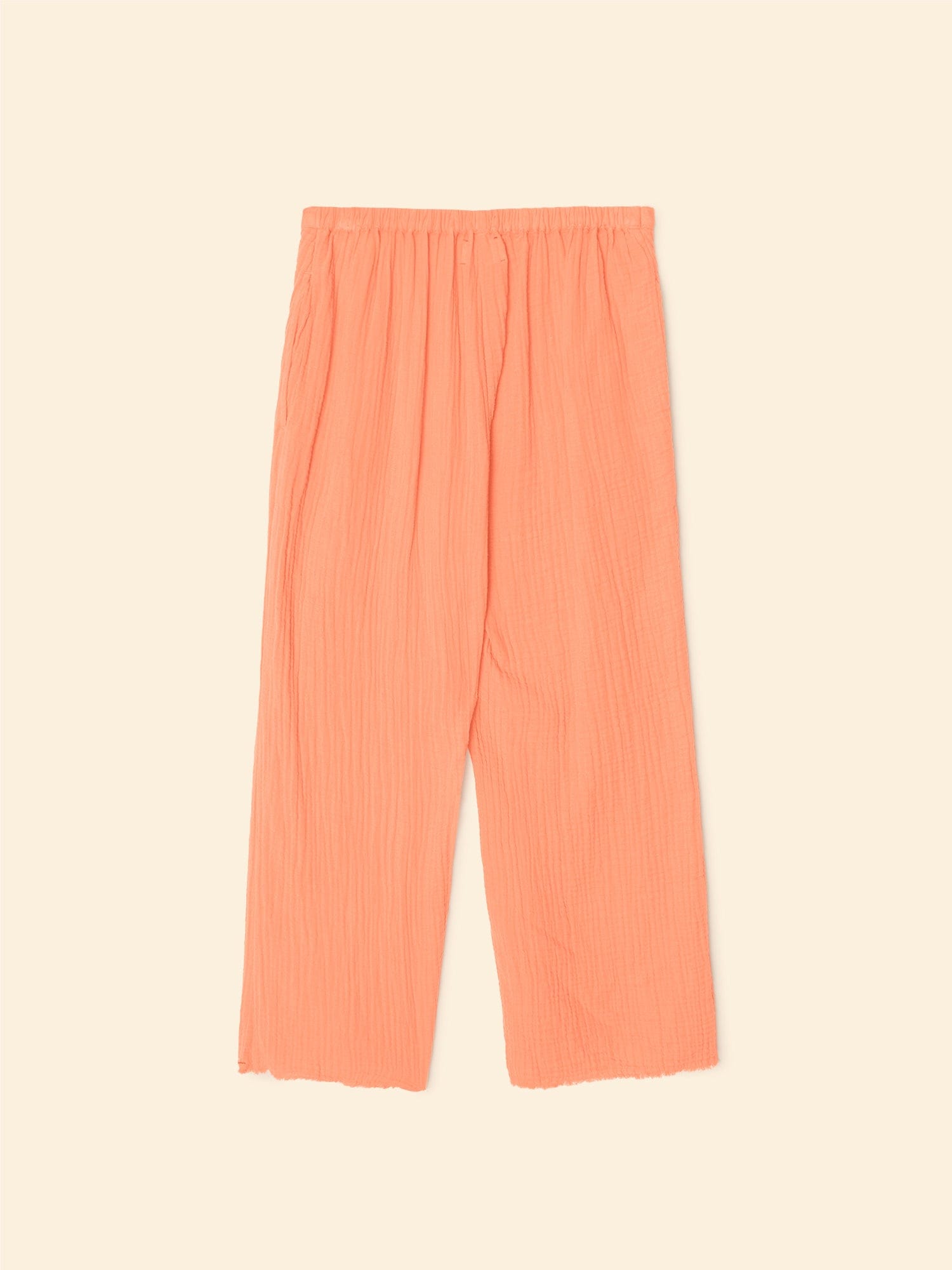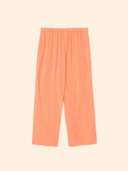 Sitting Pretty. Jayde is new this season in our washed double faced cotton gauze for a soft, gently crinkled feel. Jayde is a slightly cropped pull on pant with a flat front waistband and elasticized back, side seam pockets, and a raw edge hem.
