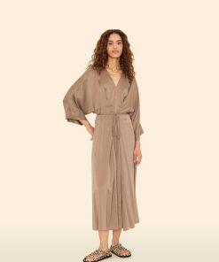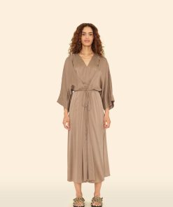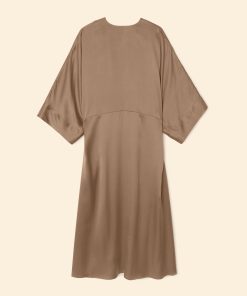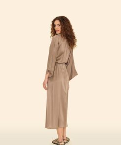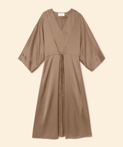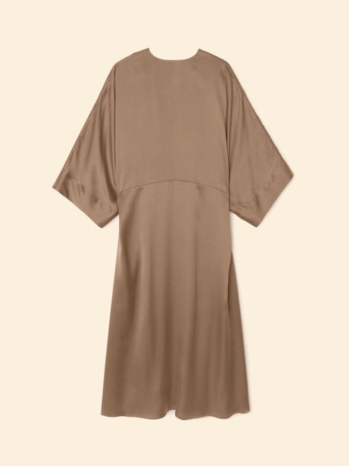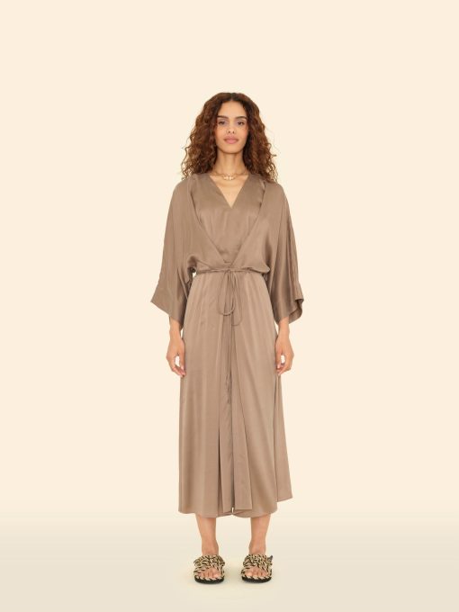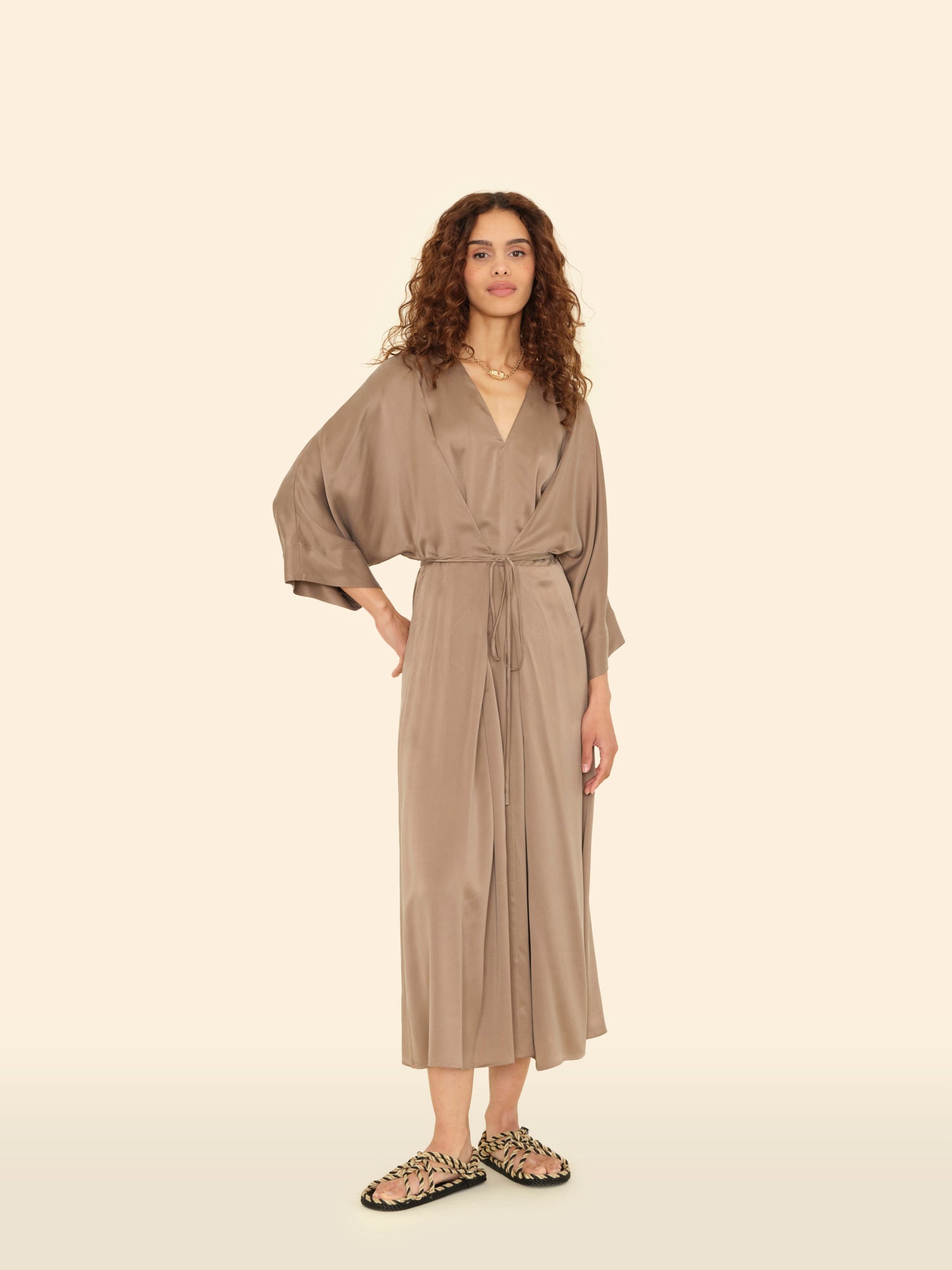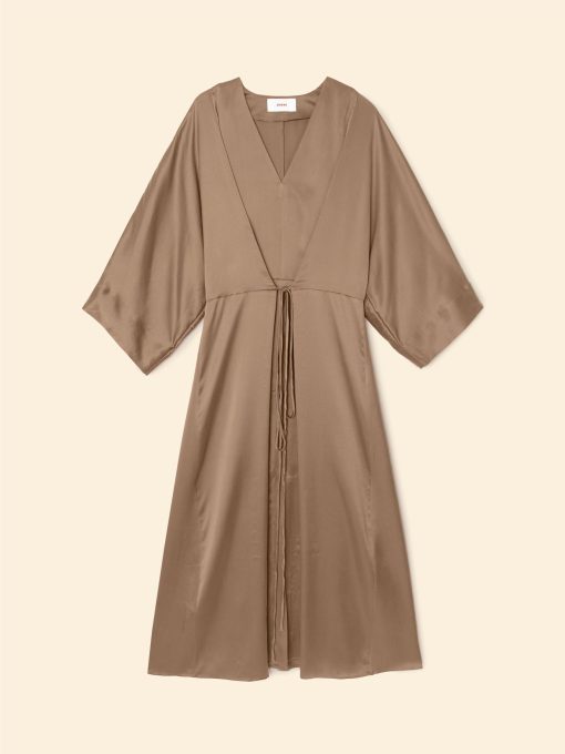 Hidden Gems. Juliet is new this season in our luxe sandwashed silk charmeuse. This elegant kimono style midi dress features a deep V-neck, self-tie waist, and a center-front slit.