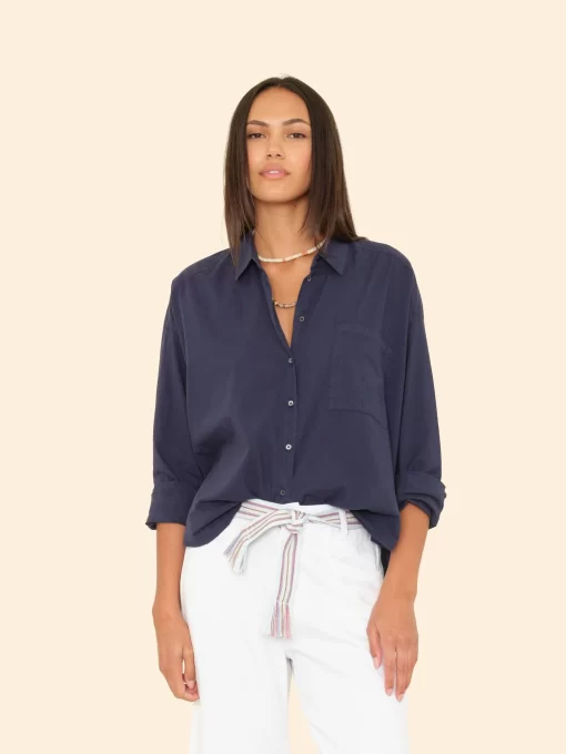 Easy does it. Jordy is made in our classic lightweight woven cotton poplin for a lived-in look and feel. Jordy is an easy button-front shirt with a boxy fit, left chest pocket, and high low shirttail hem.