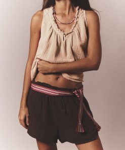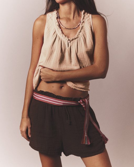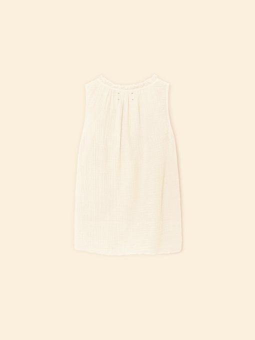 Easy Breezy. Rosie is new this season in our washed double faced cotton gauze for a soft, gently crinkled feel. This sleeveless top features a raw edge scoop neck, keyhole button-front, and shirring throughout.