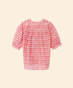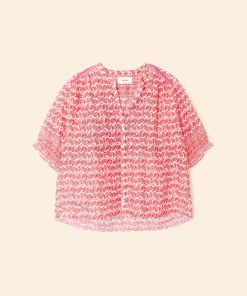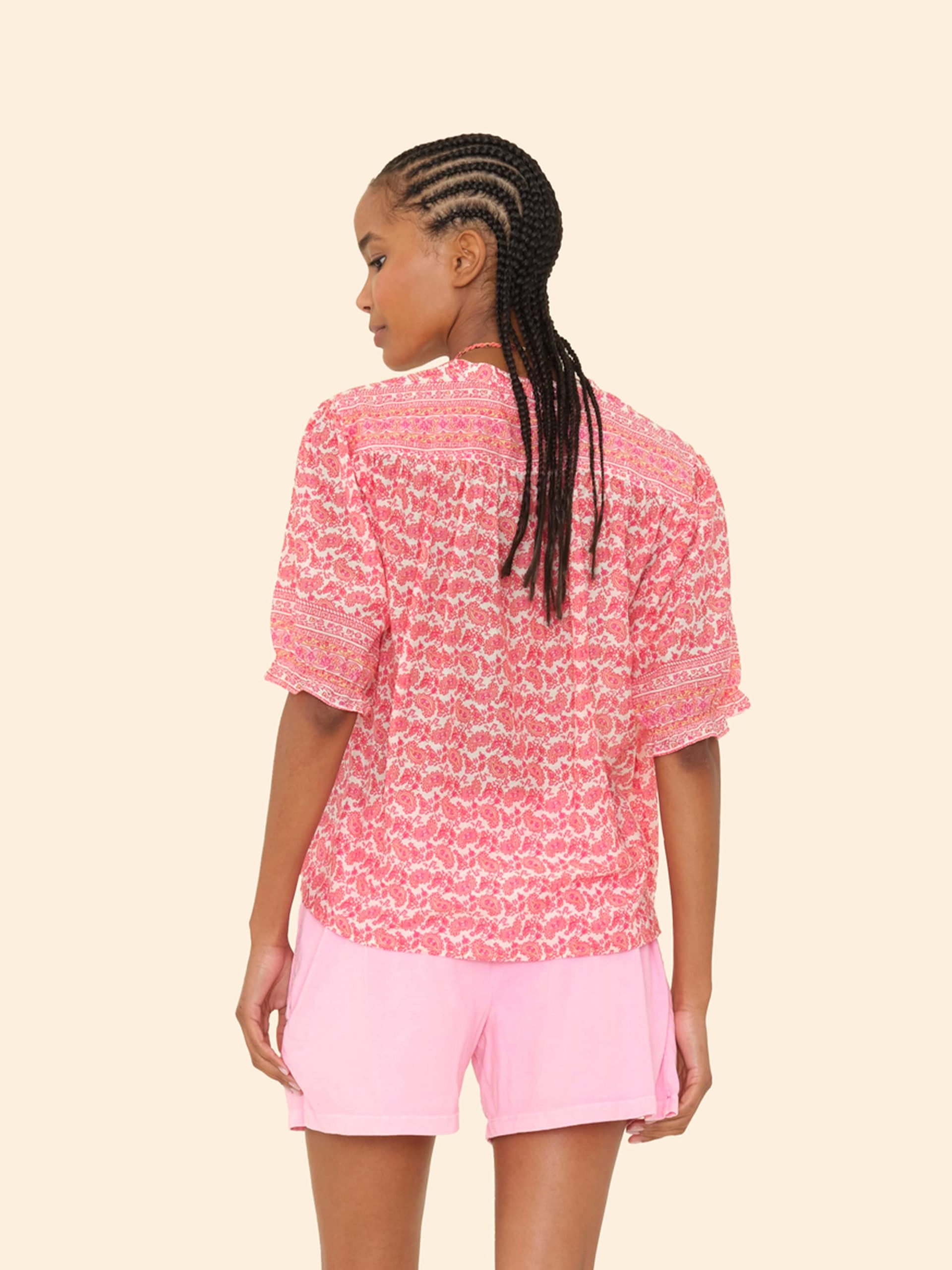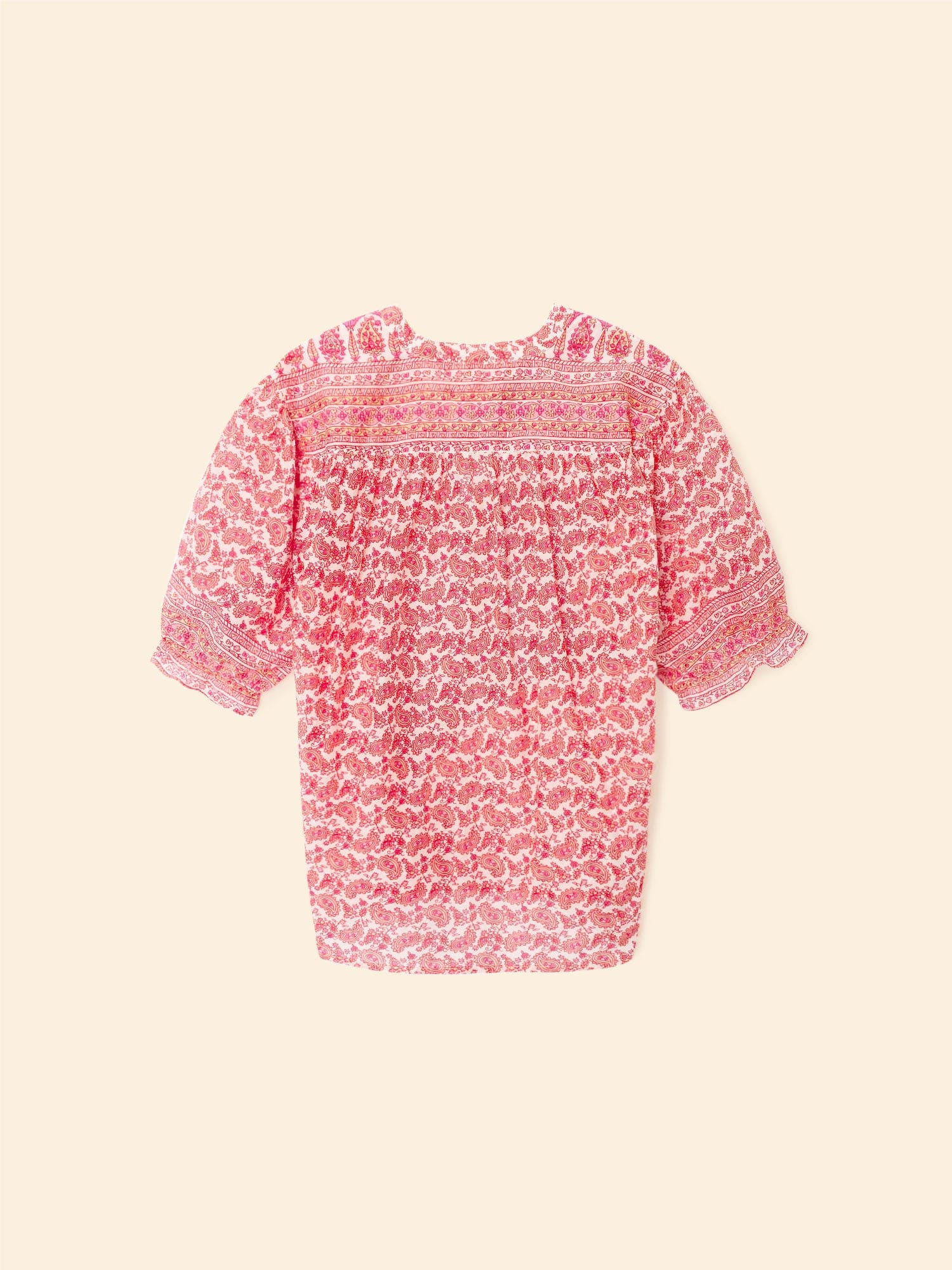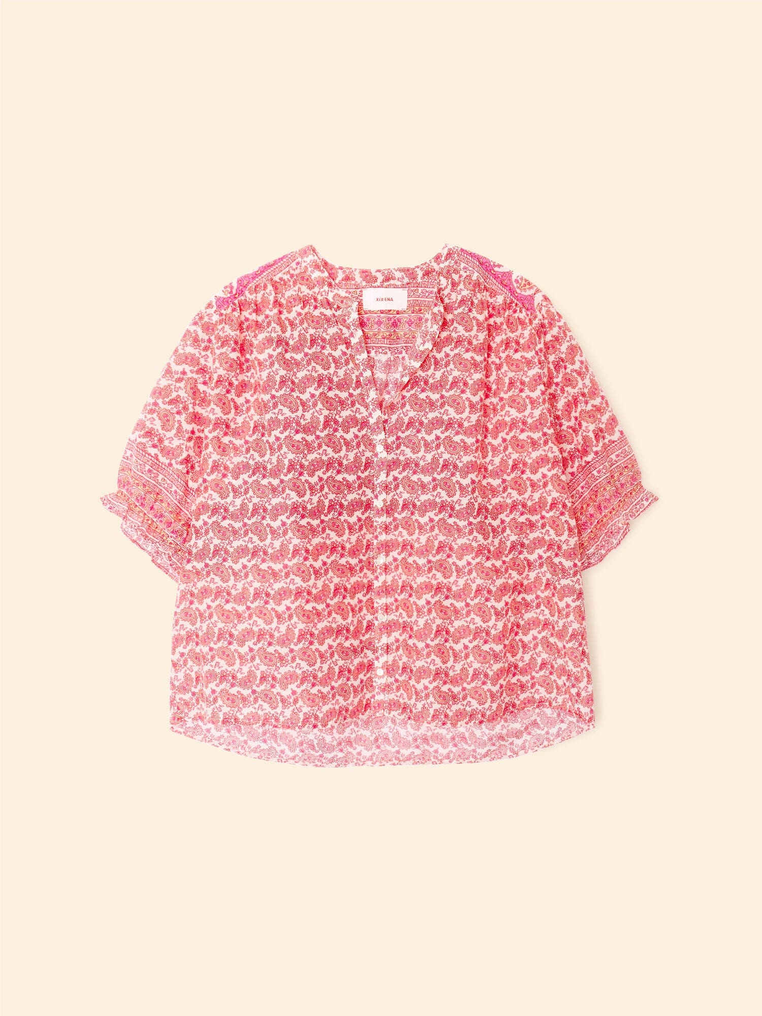 Pretty in Print. Eden is back this season in our new paisley border print cotton silk voile for an elevated feel. This easy button-front shirt has a band collar and puff sleeves with an elasticized ruffle cuff.