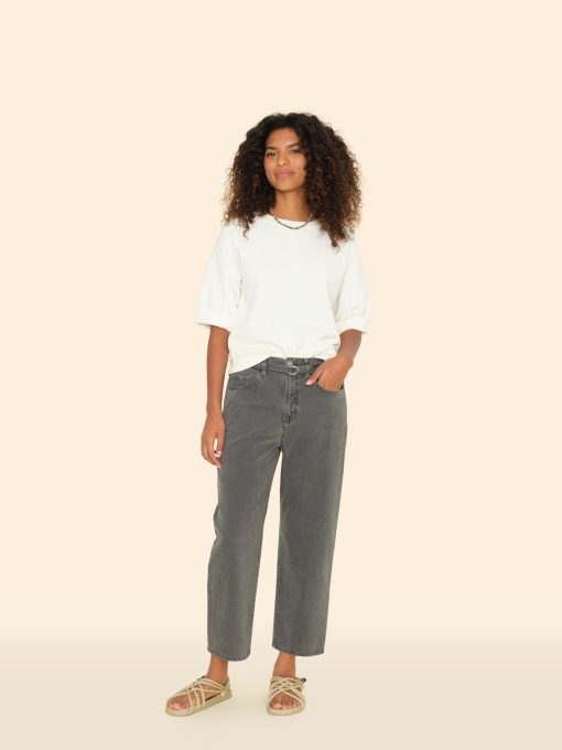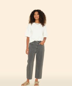Forever Denim. Brecker is back this season in our mid-weight recycled blend denim. Brecker is a slightly cropped five-pocket pant with a button-closure, zipper fly, elasticized back waist, and an adjustable D-ring belt in self-fabric.