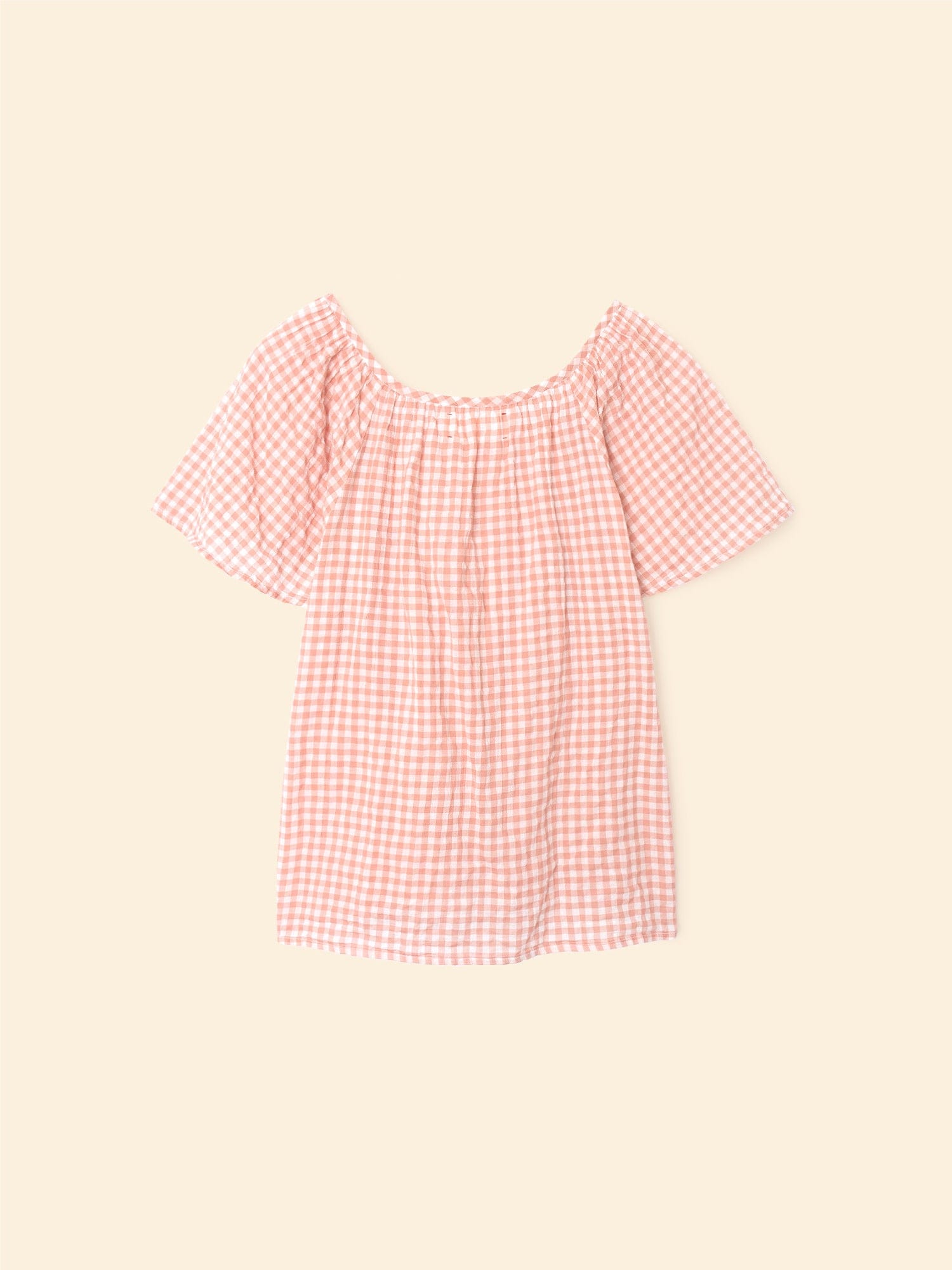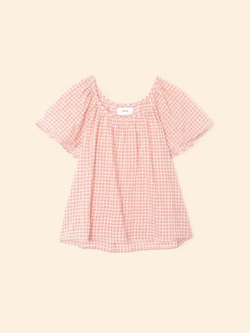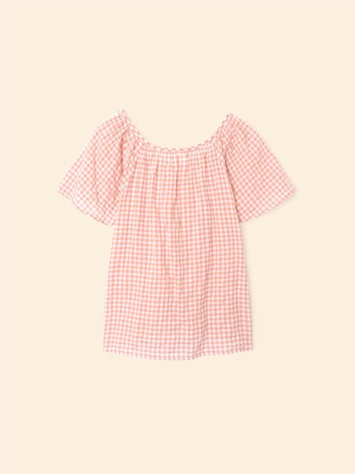 Checkmate. Marnie is new this season in our cotton gingham check with added stretch for ease of comfort. Marnie is an easy popover top with a round neck and puff sleeves.