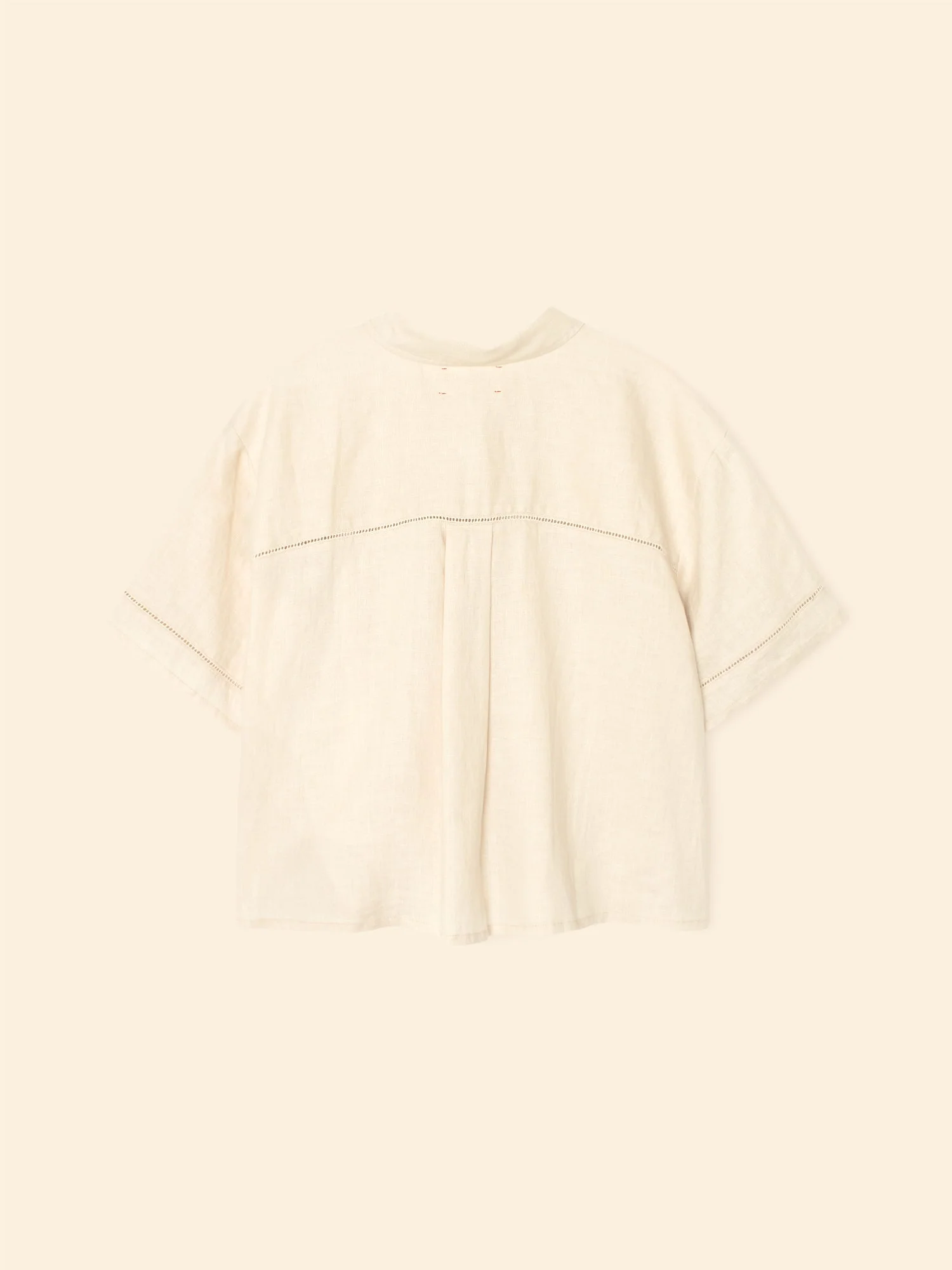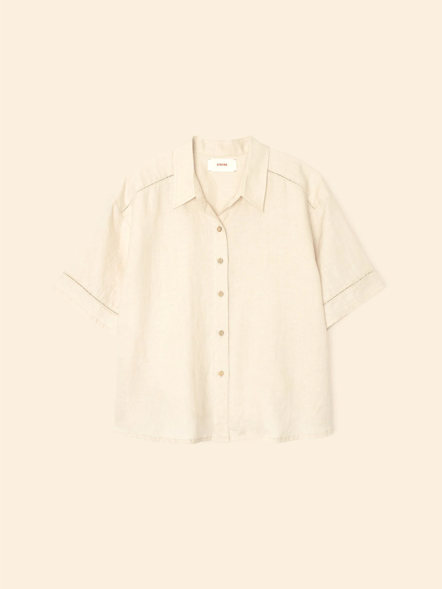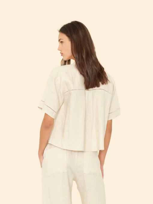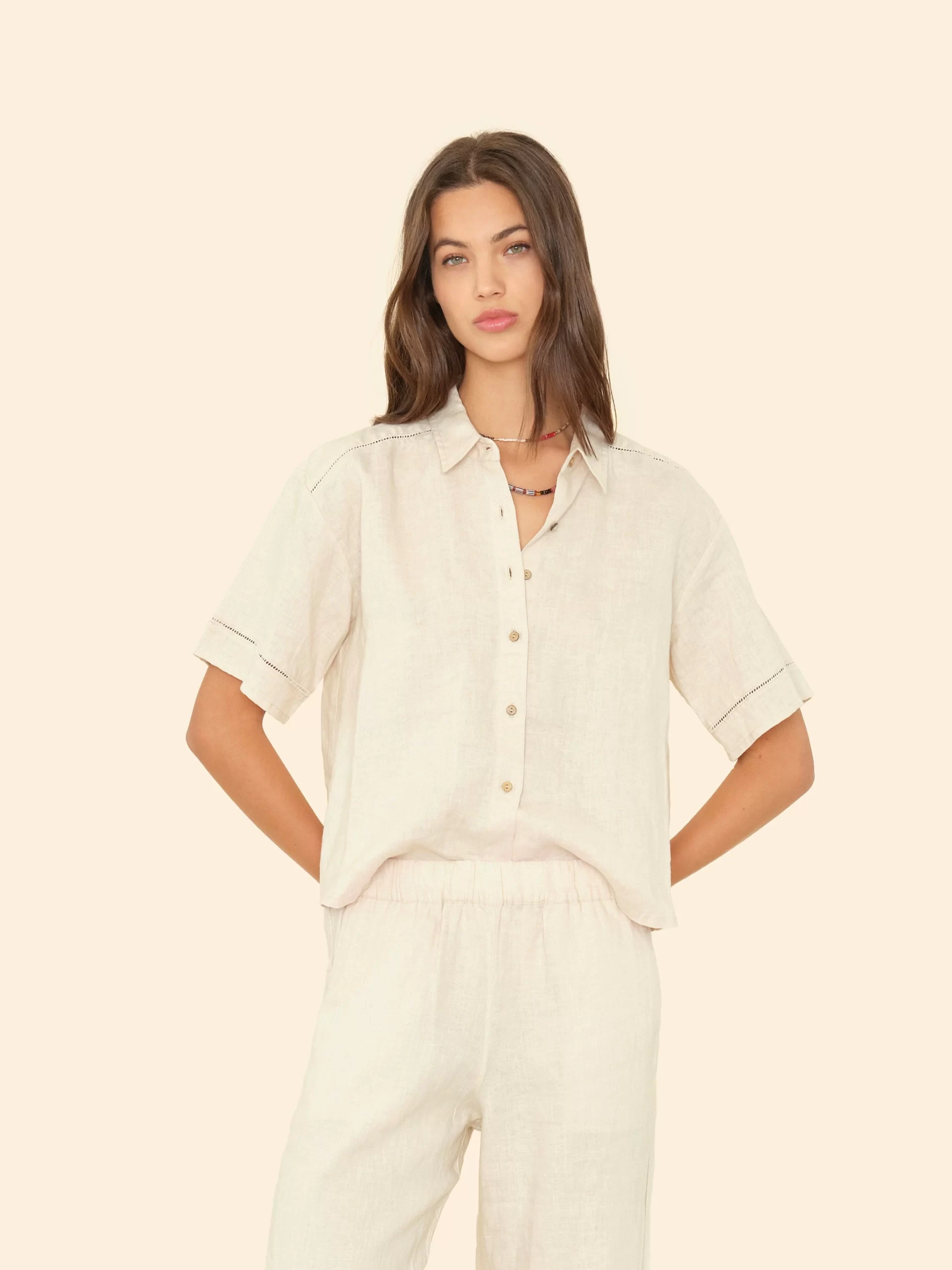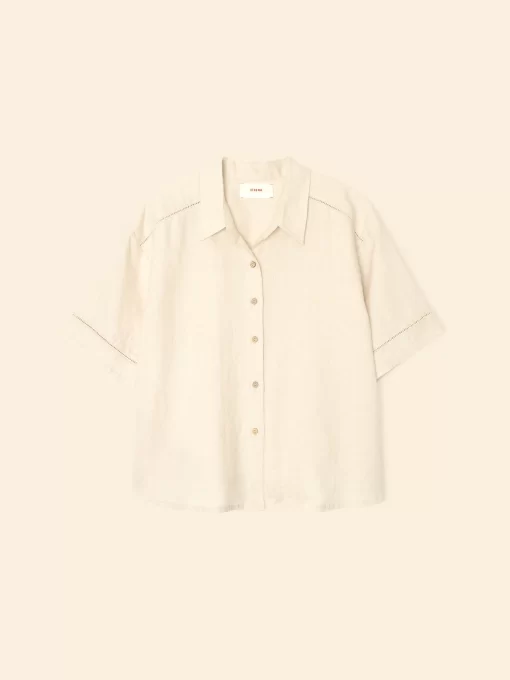 Vacation Mode. Hendry is made in our new lightweight linen. Hendry is a button-front shirt with coconut buttons and lattice trim details throughout.