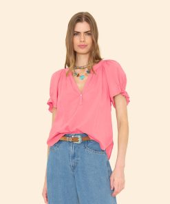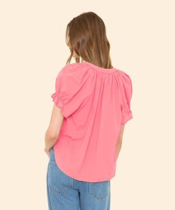 Pretty Please. Astryde is made in our classic lightweight woven cotton poplin for a lived-in look and feel. Astryde is a femme V-neck blouse that features a singular button-closure, short puff raglan sleeves with elastic ruffles, and shirred details throughout.