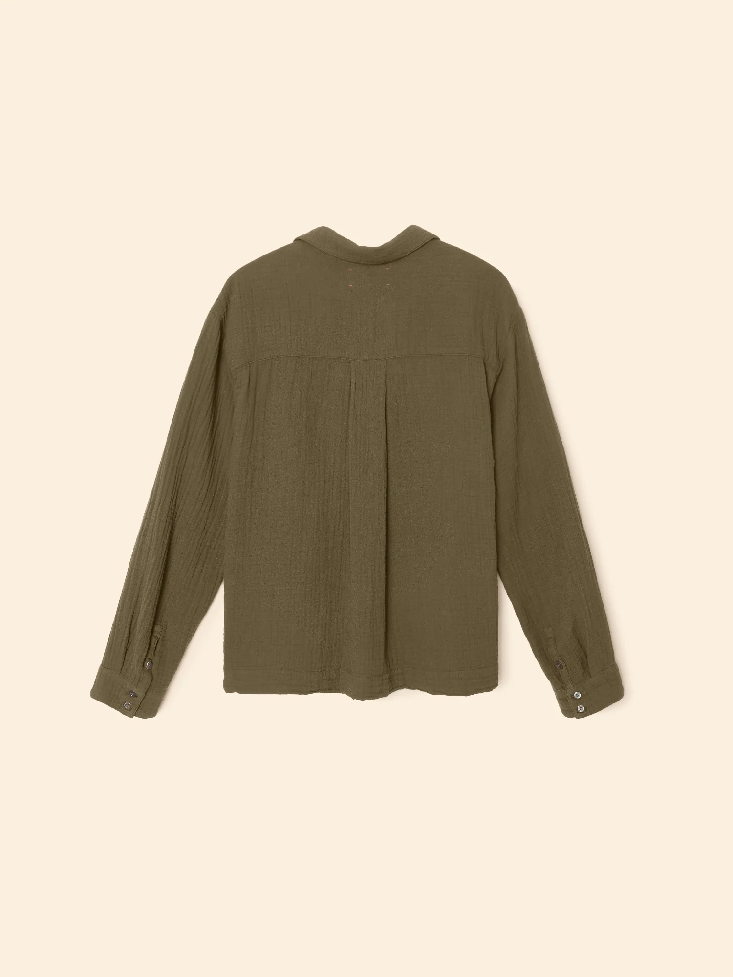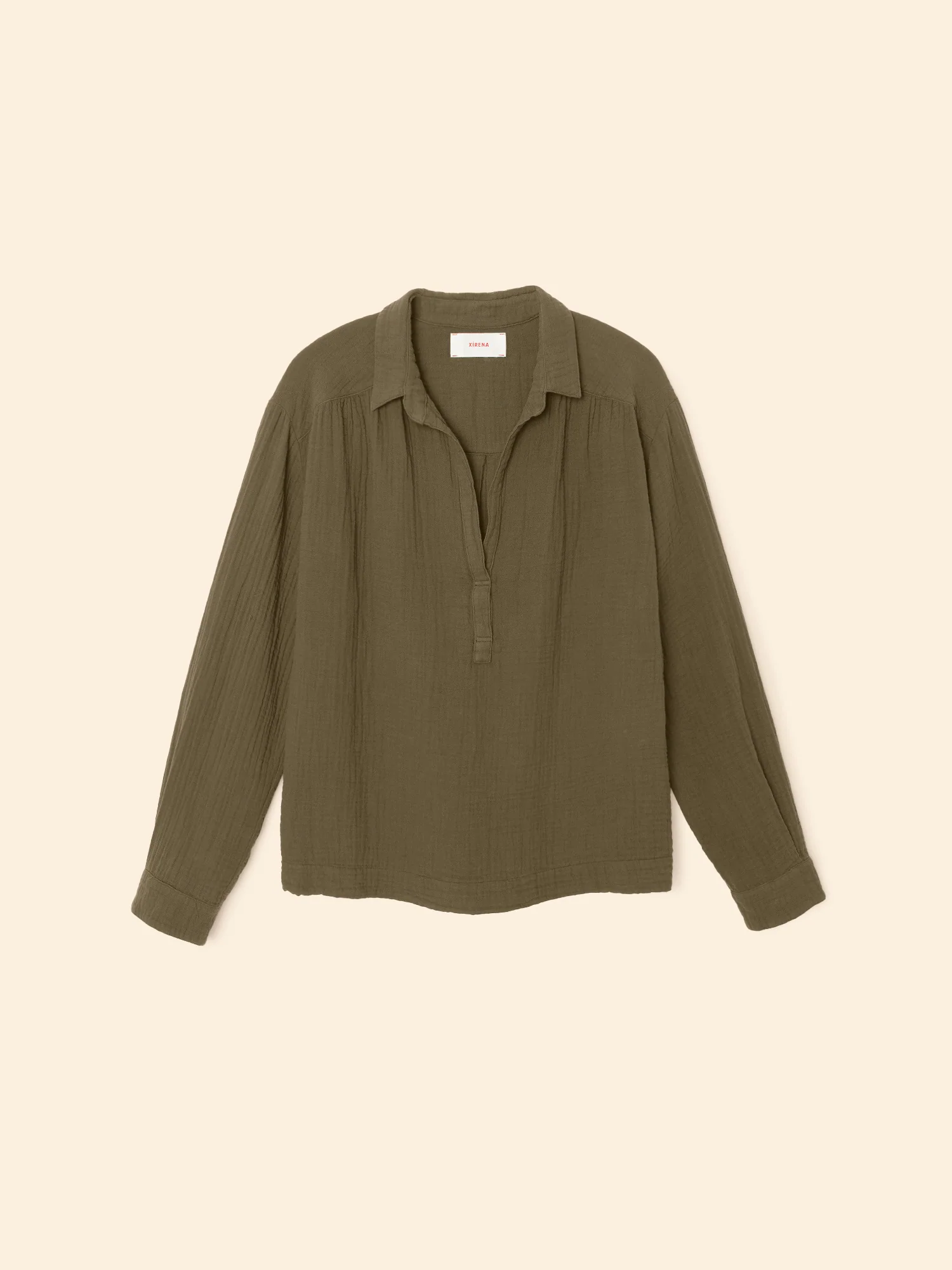 Bare Necessities. Brody is new this season in our washed double faced cotton gauze for a soft, gently crinkled feel. This easy popover top has a Johnny collar, shirred split neck, button cuffs, and a back yoke.