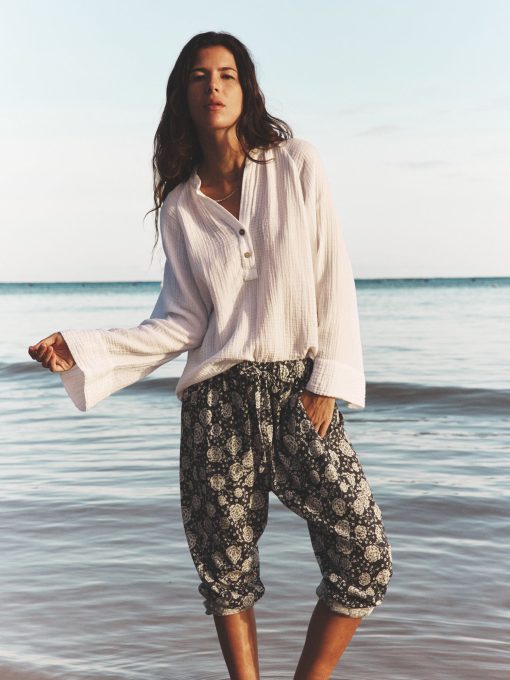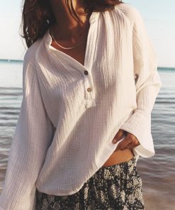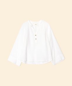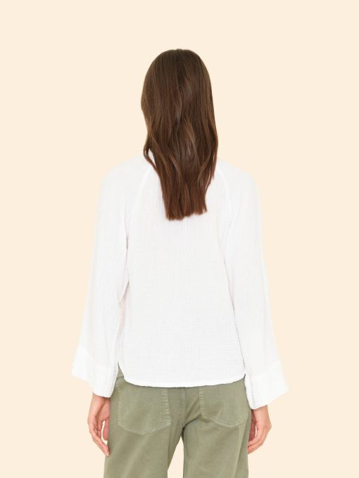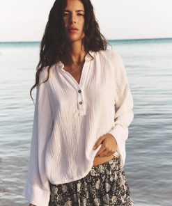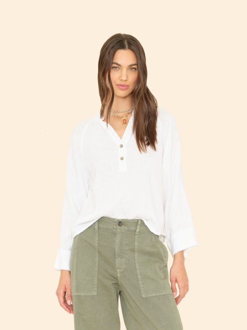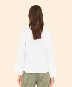 Easy Breezy. Carli is new this season in our washed double faced cotton gauze for a soft, gently crinkled feel. Carli is an easy pullover top with a V-neck, partial button-front with coconut buttons, bell sleeves, and a high low shirttail hem.