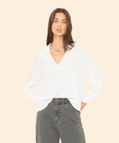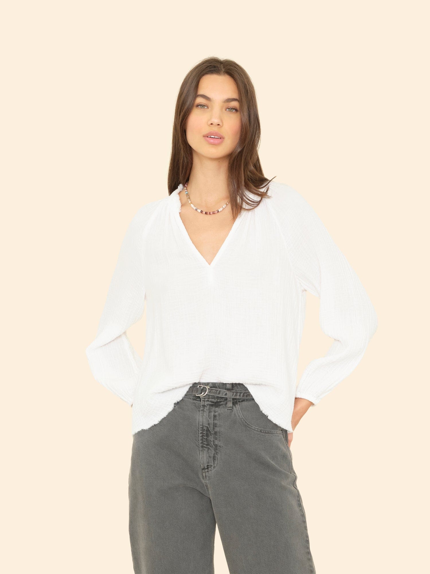 Pretty Please. Milla is new this season in our washed double faced cotton gauze for a soft, gently crinkled feel. This easy pullover top features a raw edge V-neck and bottom hem, and blouson sleeves.