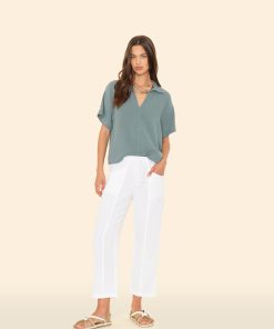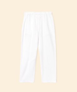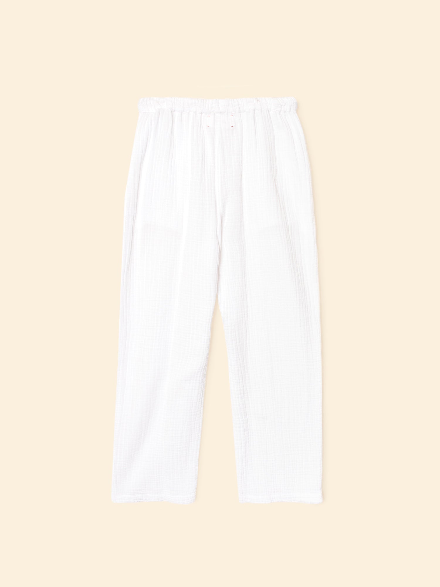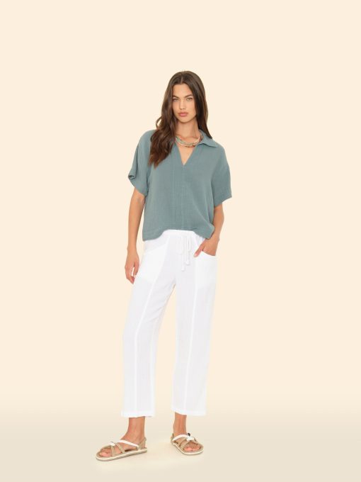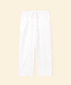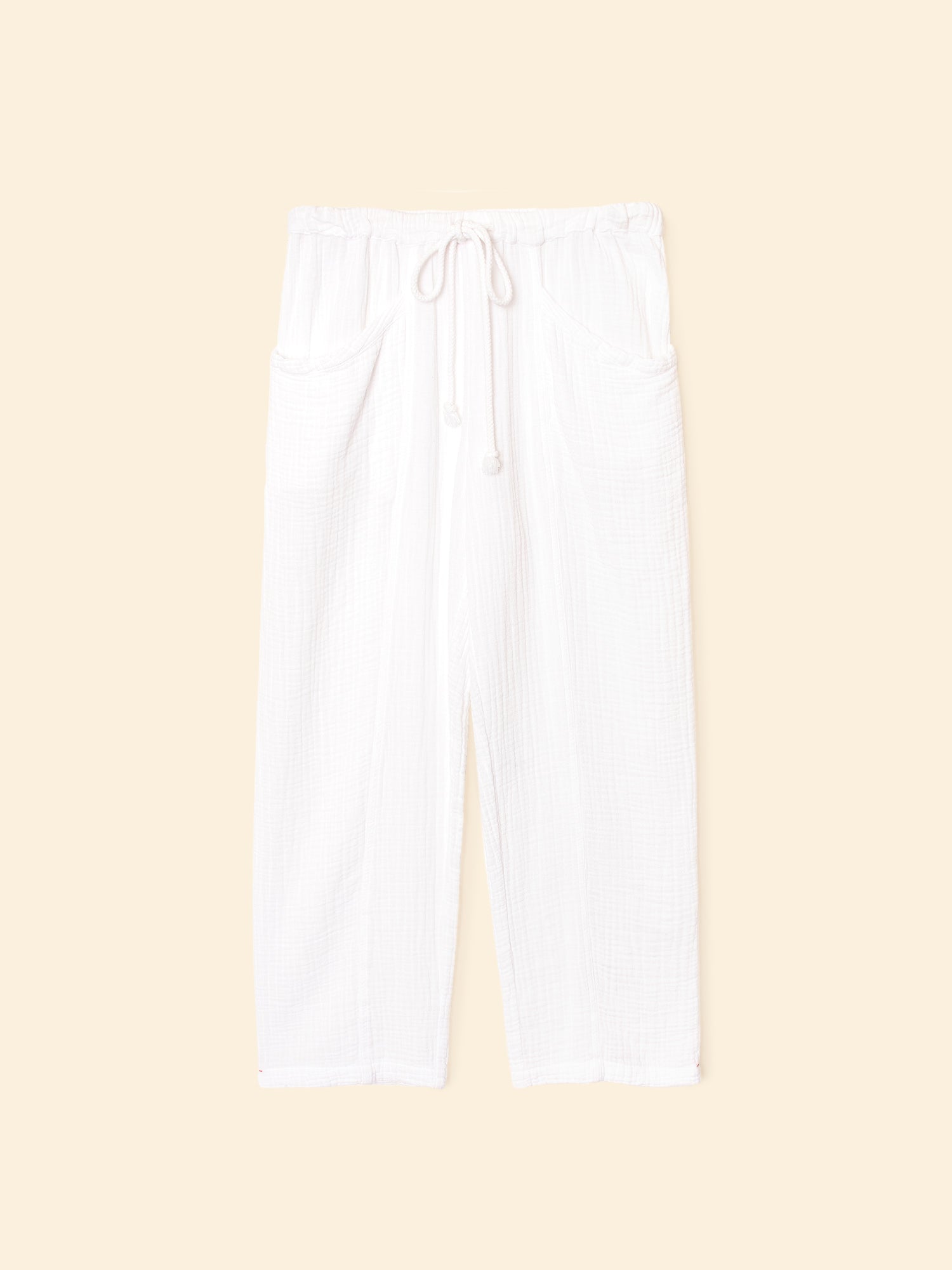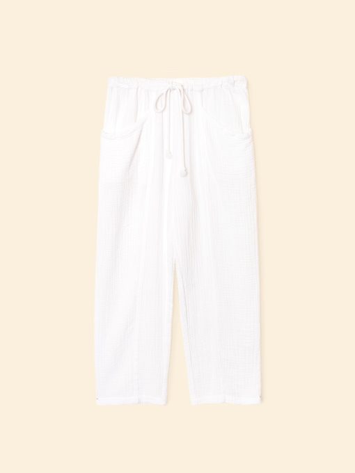 Sitting Pretty. Ozzie is new this season in our washed double faced cotton gauze for a soft, gently crinkled feel. Ozzie is a cropped pull on pant with an elasticized drawstring waist, slant pockets, and a center-front seam.